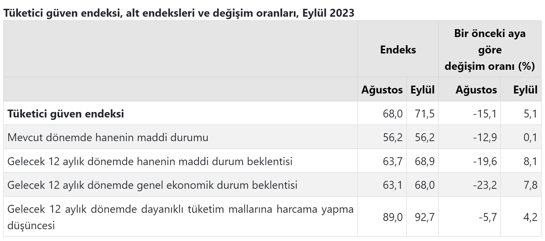 TÜİK verilerine göre Tüketici Güven Endeksi eylül ayında bir önceki aya göre yüzde 5,1 oranında artarak toparlanma kaydetti. Türkiye İstatistik Kurumu ve Türkiye Cumhuriyet Merkez Bankası iş birliği ile yürütülen tüketici eğilim anketi sonuçlarından hesaplanan tüketici güven endeksi, ağustos ayında 68,0 iken eylül ayında yüzde 5,1 oranında artarak 71,5 oldu. Kaynak: TÜİK Böylece üç aydır düşüş kaydederek 14 ayın dibini gören endeks, eylülde yeniden yükselişe geçmiş oldu. Kaynak: TÜİK Aylık tüketici eğilim anketi ile tüketicilerin maddi durum ve genel ekonomiye ilişkin mevcut durum değerlendirmeleri ile gelecek dönem beklentileri, harcama ve tasarruf eğilimleri ölçülüyor. Anket sonuçlarından hesaplanan tüketici güven endeksi 0-200 aralığında değer alabiliyor. Tüketici güven endeksinin 100’den büyük olması tüketici güveninde iyimser durumu, 100’den küçük olması tüketici güveninde kötümser durumu gösteriyor.