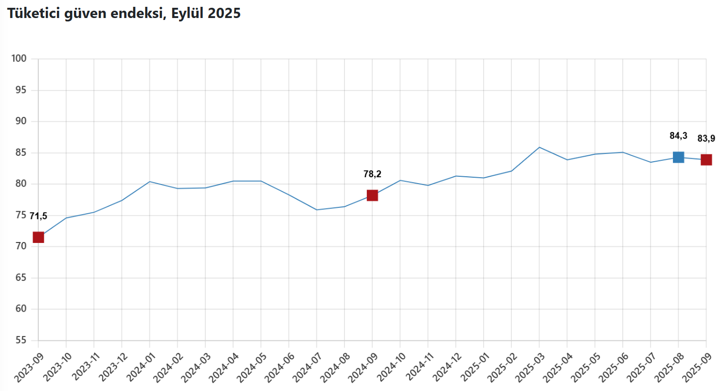 Türkiye İstatistik Kurumu (TÜİK) tarafından açıklanan verilere göre ağustos ayında 84,3 olan tüketici güven endeksi eylül ayında yüzde 0,4 oranında azalarak 83,9 oldu. Türkiye İstatistik Kurumu (TÜİK), eylül ayına ilişkin tüketici güven endeksi verilerini açıkladı. Türkiye İstatistik Kurumu ve Türkiye Cumhuriyet Merkez Bankası işbirliği ile yürütülen tüketici eğilim anketi sonuçlarından hesaplanan tüketici güven endeksi, Ağustos ayında 84,3 iken Eylül ayında yüzde 0,4 oranında azalarak 83,9 oldu. Kaynak: TÜİK