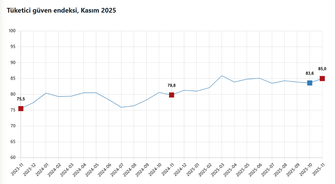 Tüketici güven endeksi, kasımda aylık bazda yüzde 1,6 artışla 85 puana yükseldi. Türkiye İstatistik Kurumu (TÜİK), kasım ayına ilişkin tüketici güven endeksi verilerini açıkladı. Türkiye İstatistik Kurumu ve Türkiye Cumhuriyet Merkez Bankası işbirliği ile yürütülen tüketici eğilim anketi sonuçlarından hesaplanan tüketici güven endeksi, Ekim ayında 83,6 iken Kasım ayında %1,6 oranında artarak 85,0 oldu. Mevcut dönemde hanenin maddi durumu endeksi, yüzde 2,7 artışla 67,7'den 69,6'ya yükseldi. Gelecek 12 aylık dönemde hanenin maddi durum beklentisi endeksi, ekimde 84,2 iken bu ay yüzde 1,9 artışla 85,7 oldu. Geçen ay 78,6 olan gelecek 12 aylık dönemde genel ekonomik durum beklentisi endeksi, bu ay yüzde 1,3 artışla 79,6 olarak hesaplandı. Gelecek 12 aylık dönemde dayanıklı tüketim mallarına harcama yapma düşüncesi endeksi ise geçen ay 104 iken, bu ay yüzde 0,9 yükselişle 105'e ulaştı.