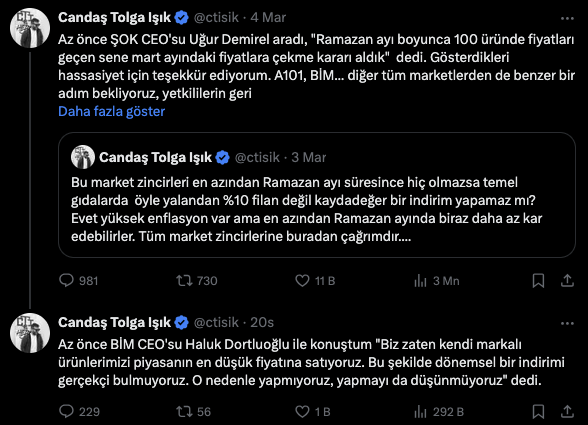 Zincir marketlerin Ramazan ayı boyunca temel gıda ürünlerinde indirim yapmasına yönelik çağrıya ŞOK olumlu yanıt verirken, BİM ise böyle bir uygulamayı uygun bulmadığını ifade etti. ŞOK, 100 üründe fiyatları bir önceki yılın mart ayındaki seviyelere çekmeye karar verirken, BİM zaten en düşük fiyat politikasını uyguladığını belirterek dönemsel bir indirime gitmeyeceğini açıkladı. Bu karşılıklı açıklamalar sosyal medyada geniş yankı uyandırdı. Çağrının Başlangıcı ve ŞOK'un İlk Hamlesi Gazeteci Candaş Tolga Işık, sosyal medya hesabı üzerinden yaptığı paylaşımda, Ramazan ayı boyunca market zincirlerinin temel gıda ürünlerinde kayda değer bir indirim yapabileceğini dile getirdi. “Bu market zincirleri en azından Ramazan ayı süresince hiç olmazsa temel gıdalarda öyle yalandan yüzde 10 filan değil kaydadeğer bir indirim yapamaz mı? Evet yüksek enflasyon var ama en azından Ramazan ayında biraz daha az kar edebilirler. Tüm market zincirlerine buradan çağrımdır” ifadeleriyle büyük marketlere seslendi. Bu çağrının ardından ilk yanıt ŞOK Marketleri’nden geldi ve şirket, belirli temel ürünlerde fiyatları geçen senenin mart ayındaki seviyesine çekeceğini duyurdu. Bu gelişmeyi yine Candaş Tolga Işık sosyal medya hesabında paylaşarak duyurdu. “Az önce ŞOK CEO’su Uğur Demirel aradı, ‘Ramazan ayı boyunca 100 üründe fiyatları geçen sene mart ayındaki fiyatlara çekme kararı aldık’ dedi. Gösterdikleri hassasiyet için teşekkür ediyorum. A101, BİM... diğer tüm marketlerden de benzer bir adım bekliyoruz, yetkililerin geri dönüşleri buradan tek tek duyuracağım” sözleriyle ŞOK'un indirim kararını aktardı. BİM'den Farklı Bir Yaklaşım ŞOK’un aldığı bu kararın ardından gözler A101 ve BİM gibi diğer büyük zincir marketlere çevrildi. Kısa süre içinde BİM’den gelen açıklama ise tartışmaları daha da alevlendirdi. BİM, Ramazan ayı boyunca ek bir indirim yapmayacağını belirtti. Işık, BİM CEO’su Haluk Dortluoğlu ile yaptığı görüşmeyi sosyal medya hesabında paylaştı: “Az önce BİM CEO’su Haluk Dortluoğlu ile konuştum, ‘Biz zaten kendi markalı ürünlerimizi piyasanın en düşük fiyatına satıyoruz. Bu şekilde dönemsel bir indirimi gerçekçi bulmuyoruz. O nedenle yapmıyoruz, yapmayı da düşünmüyoruz’ dedi.” BİM’in açıklaması sosyal medyada büyük yankı uyandırdı. Kimileri BİM’in fiyat politikası nedeniyle zaten uygun fiyat sunduğunu ve ek bir indirime gerek olmadığını savunurken, bazıları ise Ramazan ayı boyunca daha fazla kolaylık sağlanması gerektiğini dile getirdi. [news_id:764748]