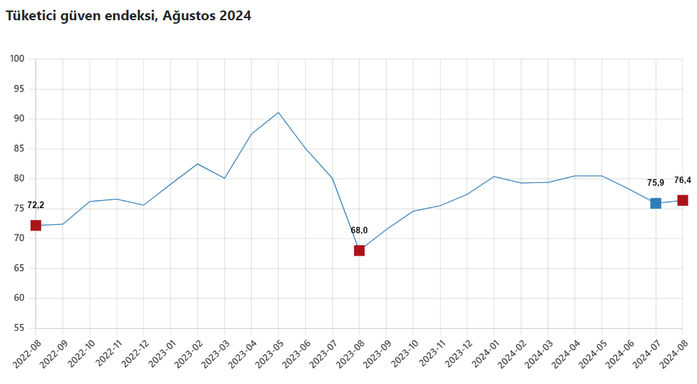 Tüketici güven endeksi, ağustosta aylık bazda yüzde 0,6 oranında artarak 76,4 oldu. Türkiye İstatistik Kurumu (TÜİK), ağustos ayına ilişkin tüketici güven endeksi verilerini açıkladı. Buna göre, TÜİK ve Türkiye Cumhuriyet Merkez Bankası işbirliği ile yürütülen tüketici eğilim anketi sonuçlarından hesaplanan tüketici güven endeksi, temmuz ayında 75,9 iken ağustos ayında yüzde 0,6 oranında artarak 76,4 oldu. Kaynak: TÜİK