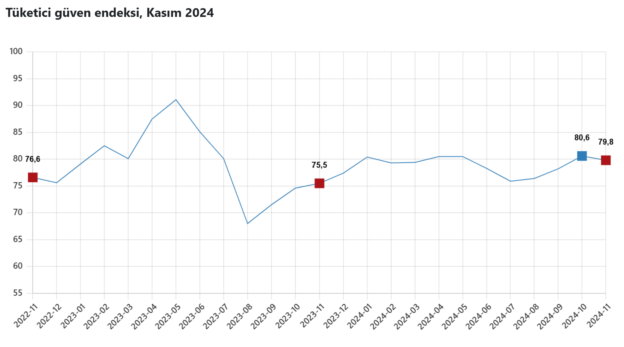 Tüketici güven endeksi, kasımda bir önceki aya göre yüzde 1 oranında azalarak 79,8 seviyesine geriledi. Endeks haziranda 16 ayın zirvesine yükselmişti. Türkiye İstatistik Kurumu (TÜİK) kasım ayı tüketici güven endeksi verilerini açıkladı. Tüketici güven endeksi, kasım ayında bir önceki aya göre yüzde 1 oranında azalarak 79,8 seviyesine geriledi. Endeks haziranda 80,6 ile 16 ayın zirvesine yükselmişti. Mevcut dönemde hanenin maddi durumu yüzde 2,1 yükselişle 66,1 olurken, gelecek 12 aylık dönemde hanenin maddi durum beklentisi yüzde 2,1 düşüşle 80,6 olarak gerçekleşti. Kaynak: TÜİK Gelecek 12 aylık dönemde genel ekonomik durum beklentisi yüzde 2 azalışla 73,8, gelecek 12 aylık dönemde dayanıklı tüketim mallarına harcama yapma düşüncesi yüzde 1,5 azalışla 98,6 oldu. Kritik eşik 100 Tüketici güven endeksi 0-200 aralığında değer alabiliyor. Tüketici güven endeksinin 100'den büyük olması tüketici güveninde iyimser durumu, 100'den küçük olması tüketici güveninde kötümser durumu gösteriyor.
