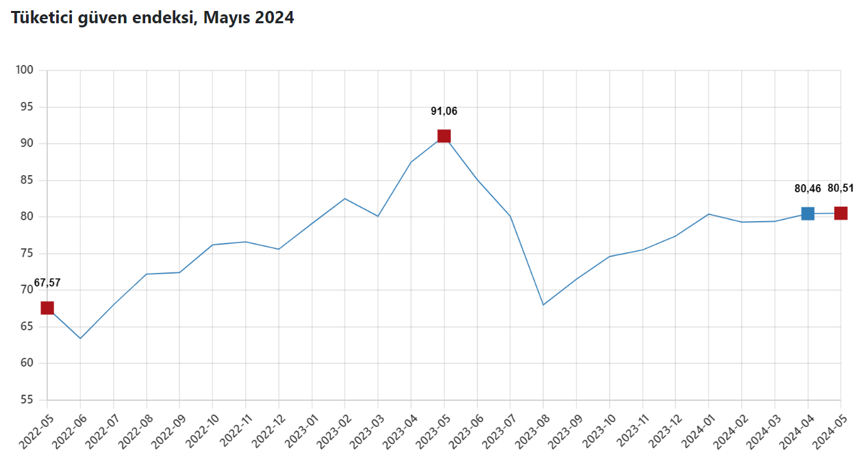 Tüketici güven endeksi mayıs ayında yüzde 0,1 artarak 80,51 seviyesine çıktı. Tüketici güven endeksi, mayıs bir önceki aya göre yüzde 0,1 artarak 80,51 değerini aldı. Endeks nisan ayında 80,46 değerini almıştı. Kaynak: TÜİK Türkiye İstatistik Kurumu (TÜİK) ve Merkez Bankası (TCMB) tarafından açıklanan tüketici güven endeksi 0 ile 200 arasında bir değer alıyor. Endeks'in 100'den büyük olması tüketici güveninde iyimser durumu, 100'den küçük olması tüketici güveninde kötümser durumu gösteriyor.