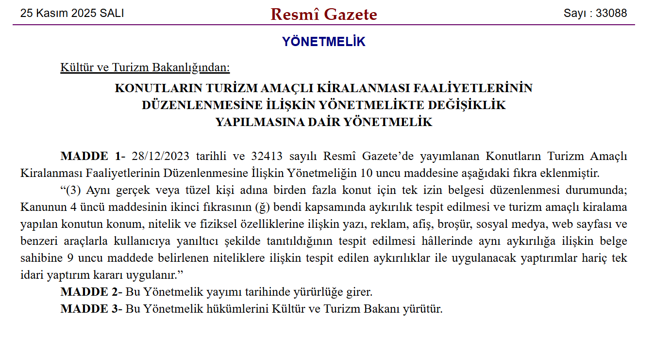Kültür ve Turizm Bakanlığı, Turizm Amaçlı Kiralama Yönetmeliği'nde değişiklik yaparak, birden fazla konut için yanıltıcı tanıtım yapan işletmelere tek idari yaptırım uygulanmasını kararlaştırdı. Kültür ve Turizm Bakanlığı'nın hazırladığı “Konutların Turizm Amaçlı Kiralanması Faaliyetlerinin Düzenlenmesine İlişkin Yönetmelikte Değişiklik Yapılmasına Dair Yönetmelik”, 28 Aralık 2023 tarihli esas yönetmelikte önemli bir düzenlemeye gitti. Resmi Gazete'de yayımlanarak yürürlüğe giren değişiklik içerisinde, özellikle birden fazla konut için tek izin belgesi bulunan işletmeler açısından önemli hükümler yer aldı. Yeni düzenlemeye göre aynı gerçek veya tüzel kişi adına birden fazla konutun tek bir izin belgesiyle kiralanması durumunda, konutların tanıtımında yanıltıcı ifadeler kullanılması halinde uygulanacak yaptırımlarda değişikliğe gidildi. Yönetmeliğe eklenen yeni fıkra ile kiralanan konutun konumu, niteliği veya fiziksel özelliklerine ilişkin reklam, afiş, broşür, sosyal medya paylaşımları, web siteleri ve benzeri tanıtım araçları üzerinden kullanıcıların yanıltıldığının tespiti hâlinde tek bir idari yaptırım kararı uygulanacağı hükme bağlandı. Yönetmelik, yayımlandığı tarih itibarıyla yürürlüğe girdi. Hükümleri ise Kültür ve Turizm Bakanı tarafından uygulanacak. Kaynak: Resmi Gazete