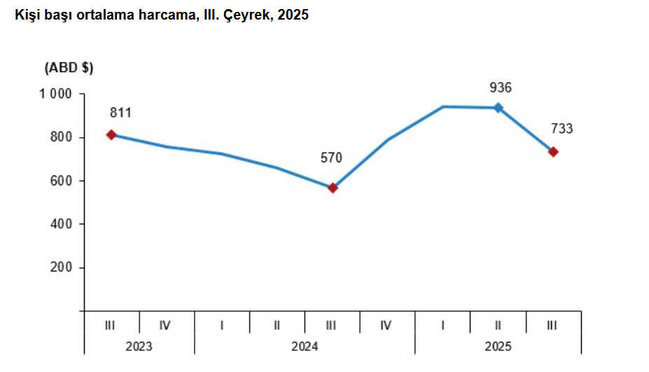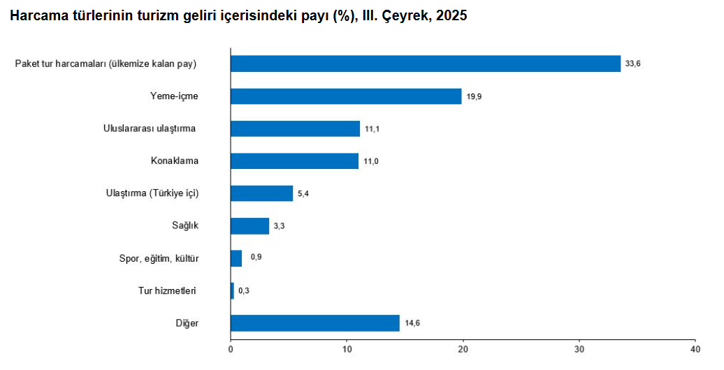 Turizm gelirleri yılın ilk 9 aylık dönemde yüzde 5,7 artışla 50 milyar 36 milyon dolara çıktı. Türkiye İstatistik Kurumu (TÜİK), temmuz-eylül dönemine ilişkin turizm istatistiklerini açıkladı. Buna göre turizm geliri, söz konusu dönemde geçen yılın aynı çeyreğine kıyasla yüzde 3,9 yükselişle 24 milyar 257 milyon 815 bin dolar olarak kaydedildi. Ziyaretçilerden elde edilen turizm geliri 24 milyar 46 milyon 779 bin dolar, transfer yolculardan sağlanan turizm geliri de 211 milyon 37 bin dolar oldu. Turizm gelirinin yüzde 16,1'i ülkeyi ziyaret eden yurt dışı ikametli vatandaşlardan elde edildi. Ziyaretçiler, seyahatlerini kişisel veya paket turla organize etti. Bu çeyrekte yapılan harcamaların 15 milyar 975 milyon 385 bin dolarını kişisel, 8 milyar 71 milyon 394 bin dolarını ise paket tur harcamaları oluşturdu. Ülkeden çıkış yapan ziyaretçi sayısı bu yılın üçüncü çeyreğinde geçen yılın aynı dönemine göre yüzde 1,9 artarak 23 milyon 639 bin 736 kişiye yükseldi. Bu ziyaretçilerin yüzde 14,5'ini 3 milyon 438 bin 655 kişiyle yurt dışında ikamet eden vatandaşlar oluşturdu. Söz konusu çeyrekte Türkiye'de geceleme yapan ziyaretçilerin gecelik ortalama harcaması 100 dolar oldu. Yurt dışında ikamet eden vatandaşların gecelik ortalama harcamasının ise 64 dolar olduğu görüldü. Temmuz-eylül döneminde turizm geliri içinde paket tur harcamalarının payı yüzde 33,6, yeme içme harcamalarının payı yüzde 19,9, uluslararası ulaştırma harcamalarının payı ise yüzde 11,1 oldu. Sağlık harcamaları geçen yılın aynı dönemine göre yüzde 20,3, konaklama harcamaları yüzde 17,3, yeme içme harcamaları yüzde 14,8 artış gösterdi. Ziyaretçiler, Türkiye'ye yüzde 73,8 ile en çok "gezi, eğlence, sportif ve kültürel faaliyetler" amacıyla geldi. İkinci sırada yüzde 17,3 ile "akraba ve arkadaş ziyareti", üçüncü sırada ise yüzde 3,7 ile "alışveriş" yer aldı. Yurt dışı ikametli vatandaşlar ise ülkeye yüzde 59,9 ile en çok "akraba ve arkadaş ziyareti" amacıyla geldi. Turizm gideri yüzde 32,3 arttı Yurt içinde ikamet edip başka ülkelere ziyarette bulunan vatandaşların harcamalarından oluşan turizm gideri, yılın üçüncü çeyreğinde geçen yılın aynı çeyreğine göre yüzde 32,3 artarak 2 milyar 479 milyon 210 bin dolar oldu. Bunun 2 milyar 34 milyon 647 bin dolarını kişisel, 444 milyon 563 bin dolarını ise paket tur harcamaları oluşturdu. Aynı dönemde yurt dışını ziyaret eden vatandaşların sayısı yıllık bazda yüzde 3 yükselerek 3 milyon 383 bin 353 kişiye ulaşırken kişi başı ortalama harcama 733 dolar olarak kayıtlara geçti. Kaynak: TÜİK