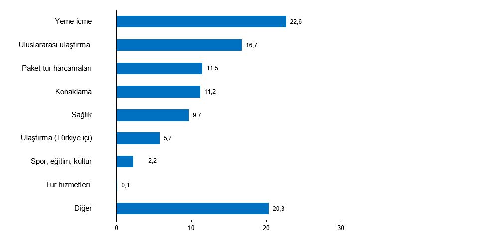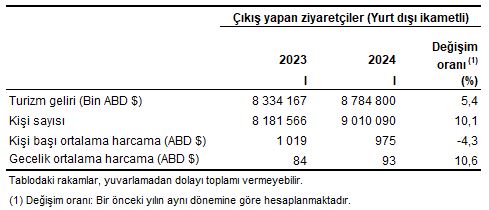 Türkiye'nin turizm geliri 2024 yılının ilk çeyreğinde bir önceki yılın aynı çeyreğine göre yüzde 5,4 artarak 8 milyar 784 milyon 800 bin dolar oldu. Türkiye İstatistik Kurumu (TÜİK) 2024 yılının ilk çeyreğine ilişkin Turizm İstatistikleri'ni açıkladı. Turizm geliri Ocak, Şubat ve Mart aylarından oluşan I. çeyrekte bir önceki yılın aynı çeyreğine göre %5,4 artarak 8 milyar 784 milyon 800 bin dolar oldu. Turizm gelirinin %21'i ülkemizi ziyaret eden yurt dışı ikametli vatandaşlardan elde edildi. Ziyaretçiler, seyahatlerini kişisel veya paket tur ile organize etmektedirler. Bu çeyrekte yapılan harcamaların 7 milyar 775 milyon 627 bin dolarını kişisel harcamalar, 1 milyar 9 milyon 174 bin dolarını ise paket tur harcamaları oluşturdu. Ziyaretçi sayısı geçen yılın aynı çeyreğine göre %10,1 arttı Ülkemizden çıkış yapan ziyaretçi sayısı 2024 yılı I. çeyreğinde bir önceki yılın aynı çeyreğine göre %10,1 artarak 9 milyon 10 bin 90 kişi oldu. Ziyaretçilerin %21,6'sını 1 milyon 942 bin 94 kişi ile yurt dışında ikamet eden vatandaşlar oluşturdu. Bu çeyrekte ülkemizden çıkış yapan ziyaretçilerin gecelik ortalama harcaması 93 dolar oldu. Yurt dışında ikamet eden vatandaşların gecelik ortalama harcaması ise 64 dolar oldu. Turizm geliri ve ziyaretçi sayısı, I. Çeyrek: Ocak-Mart, 2024 Harcama türlerinin turizm geliri içerisindeki payı (%), I. Çeyrek, 2024 Ziyaretçiler %46 ile en çok "gezi, eğlence, sportif ve kültürel faaliyetler" amacıyla geldi İkinci sırada %31,3 ile "akraba ve arkadaş ziyareti", üçüncü sırada ise %9,6 ile "alışveriş" yer aldı. Yurt dışı ikametli vatandaşlar ise ülkemize %73,6 ile en çok "akraba ve arkadaş ziyareti" amacıyla geldi. Turizm gideri geçen yılın aynı çeyreğine göre %11,3 arttı Yurt içinde ikamet edip başka ülkeleri ziyaret eden vatandaşlarımızın harcamalarından oluşan turizm gideri, geçen yılın aynı çeyreğine göre %11,3 artarak 1 milyar 779 milyon 649 bin dolar oldu. Bunun 1 milyar 444 milyon 620 bin dolarını kişisel harcamalar, 335 milyon 30 bin dolarını ise paket tur harcamaları oluşturdu. Yurt dışını ziyaret eden vatandaşlar 2023 yılı I. çeyreğine göre %18,4 arttı Bu çeyrekte yurt dışını ziyaret eden vatandaş sayısı bir önceki yılın aynı çeyreğine göre %18,4 artarak 2 milyon 449 bin 225 kişi oldu. Bunların kişi başı ortalama harcaması 727 dolar olarak gerçekleşti. Kişi başı ortalama harcama, I. Çeyrek, 2024 Bu konu ile ilgili bir sonraki haber bülteninin yayımlanma tarihi 31 Temmuz 2024'tür. [news_id:731587]