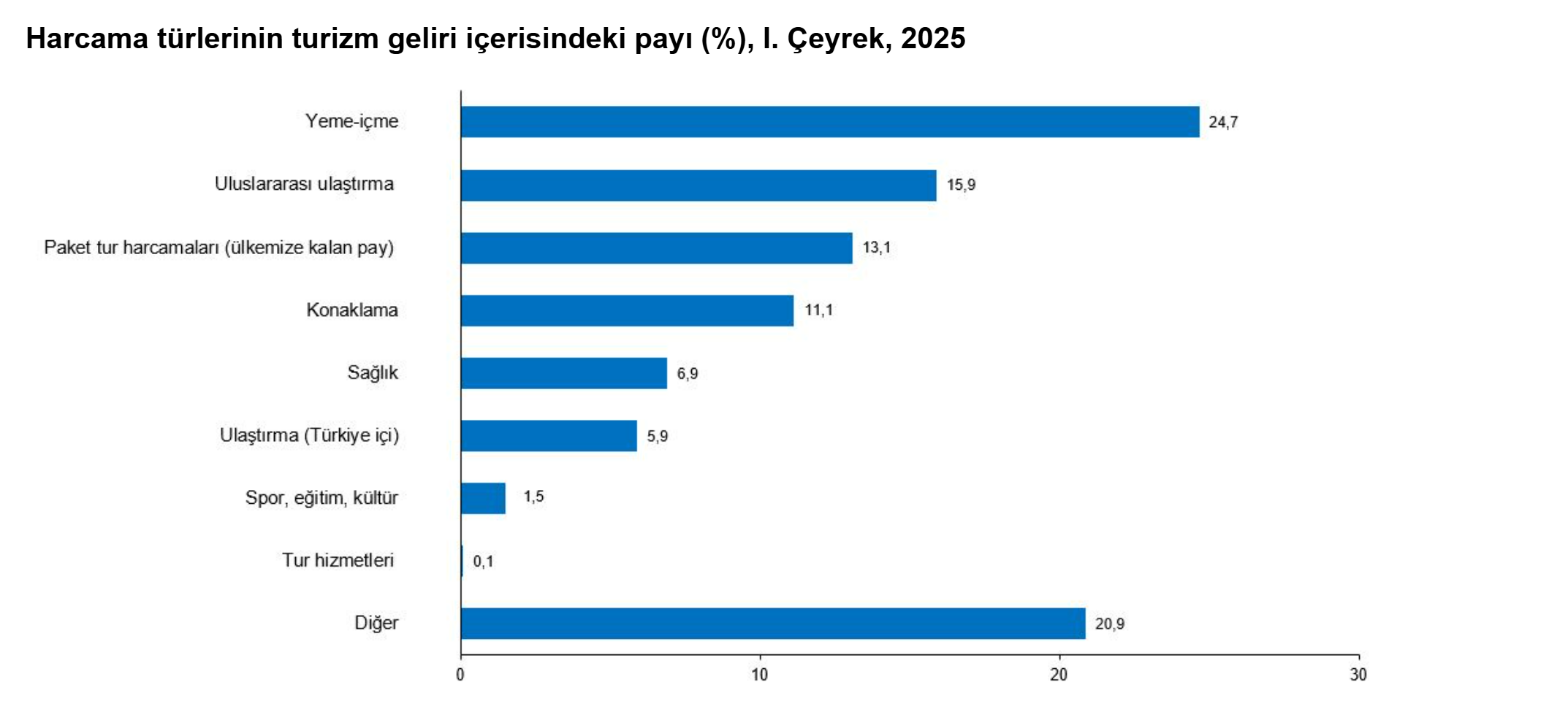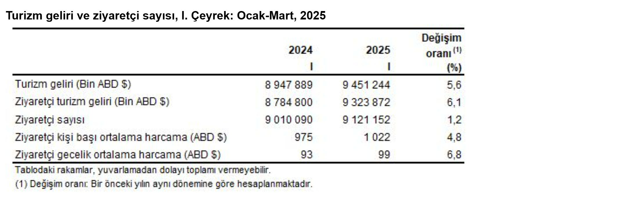 Türkiye'nin turizm geliri 2025 yılının ilk çeyreğinde bir önceki yılın aynı çeyreğine göre yüzde 5,6 artarak 9 milyar 451 milyon 255 bin dolar oldu. Bu dönemde ziyaretçilerin gecelik harcama tutarının ise 99 dolara çıktığı hesaplandı. Türkiye İstatistik Kurumu (TÜİK) 2025 yılının ilk çeyreğine ilişkin Turizm İstatistikleri'ni açıkladı. Turizm geliri Ocak, Şubat ve Mart aylarından oluşan I. çeyrekte bir önceki yılın aynı çeyreğine göre %5,6 artarak 9 milyar 451 milyon 244 bin dolar oldu. Ziyaretçilerden elde edilen turizm geliri 9 milyar 323 milyon 872 bin dolar, transfer yolculardan elde edilen turizm geliri ise 127 milyon 373 bin dolar oldu. Ziyaretçilerin turizm gelirinin %23,6'sını ülkemizi ziyaret eden yurt dışı ikametli vatandaşlar oluşturdu. Ziyaretçiler, seyahatlerini kişisel veya paket tur ile organize etmektedirler. Bu çeyrekte ziyaretçiler tarafından yapılan harcamaların 8 milyar 104 milyon 875 bin dolarını kişisel harcamalar, 1 milyar 218 milyon 997 bin dolarını ise paket tur harcamaları oluşturdu. Ziyaretçi sayısı geçen yılın aynı çeyreğine göre %1,2 arttı Ülkemizden çıkış yapan ziyaretçi sayısı 2025 yılı I. çeyreğinde bir önceki yılın aynı çeyreğine göre %1,2 artarak 9 milyon 121 bin 152 kişi oldu. Ziyaretçilerin %24,3'ünü 2 milyon 219 bin 38 kişi ile yurt dışında ikamet eden vatandaşlar oluşturdu. Bu çeyrekte ülkemizde geceleme yapan ziyaretçilerin gecelik ortalama harcaması 99 dolar oldu. Yurt dışında ikamet eden vatandaşların gecelik ortalama harcaması ise 67 dolar oldu. Kaynak: TÜİK Ziyaretçiler en çok "gezi, eğlence, sportif ve kültürel faaliyetler" amacıyla geldi Bu çeyrekte turizm geliri içerisindeki yeme içme harcamalarının payı %24,7, uluslararası ulaştırma harcamalarının payı %15,9, paket tur harcamalarının payı ise %13,1 oldu. Bir önceki yılın aynı dönemine göre paket tur harcamaları %20,8, yeme içme harcamaları %15,7 ve ulaştırma (Türkiye içi) harcamaları %8,9 arttı. İkinci sırada %26,7 ile "akraba ve arkadaş ziyareti", üçüncü sırada ise %10,3 ile "alışveriş" yer aldı. Yurt dışı ikametli vatandaşlar ise ülkemize %65,7 ile en çok "akraba ve arkadaş ziyareti" amacıyla geldi. Kaynak: TÜİK Turizm gideri %37,6 arttı Turizm gideri, geçen yılın aynı çeyreğine göre %37,6 artarak 2 milyar 448 milyon 212 bin dolar oldu. Bunun 1 milyar 907 milyon 35 bin dolarını kişisel, 541 milyon 177 bin dolarını ise paket tur harcamaları oluşturdu. Yurt dışını ziyaret eden vatandaşlar %6 arttı Bu çeyrekte yurt dışını ziyaret eden vatandaş sayısı bir önceki yılın aynı çeyreğine göre %6 artarak 2 milyon 596 bin 225 kişi oldu. Bunların kişi başı ortalama harcaması 943 dolar olarak gerçekleşti.