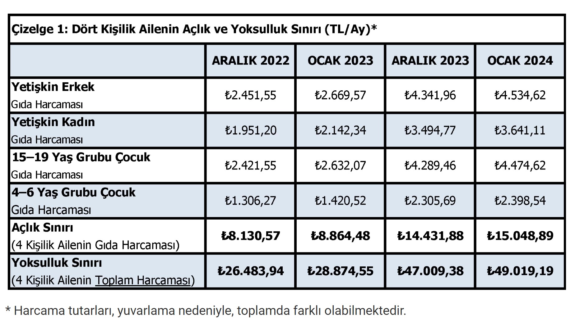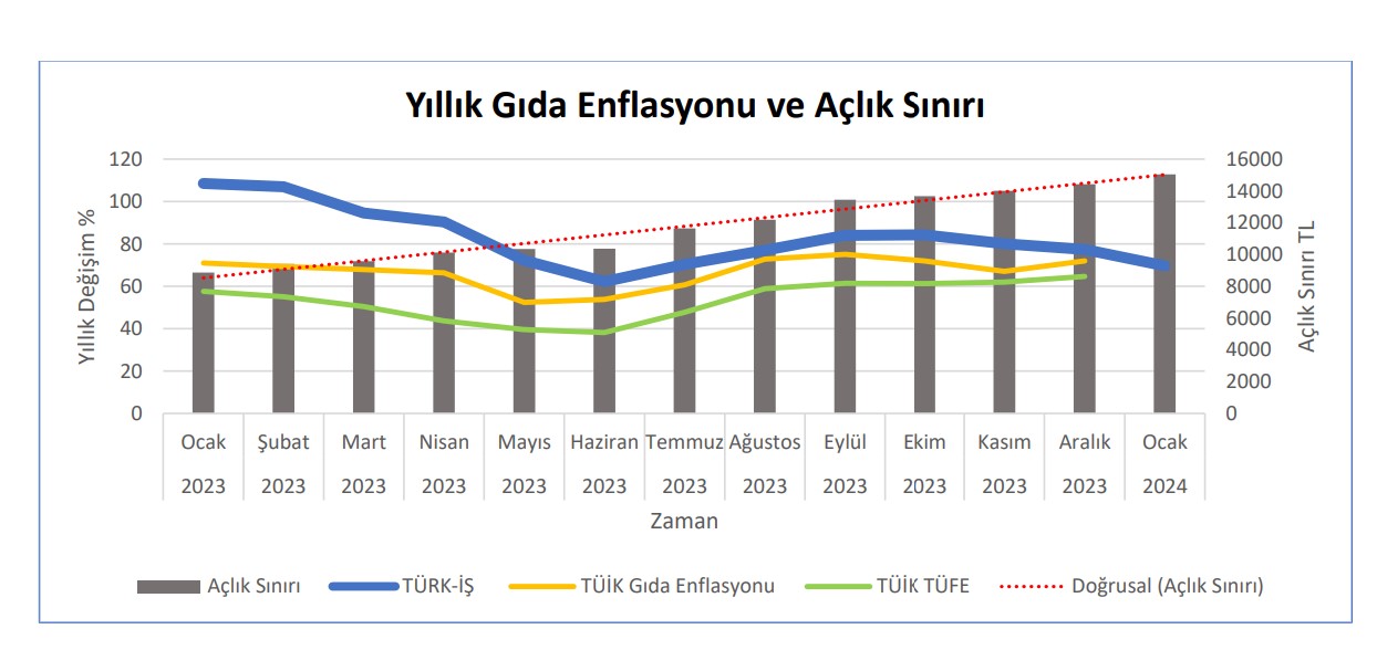 TÜRK-İŞ Ocak 2024 açlık ve yoksulluk sınırı araştırmasının sonuçlarını yayımladı. TÜRK-İŞ araştırmasına göre ocak ayında açlık sınırı 15 bin, yoksulluk sınırı ise 49 bin lirayı aştı. TÜRK-İŞ, açlık ve yoksulluk sınırı araştırmasının ocak ayı sonuçlarını açıkladı. 2024 yılının ilk aylık sonuçlarına göre Ankara’da yaşayan dört kişilik bir ailenin sağlıklı, dengeli ve yeterli beslenebilmesi için yapması gereken aylık gıda harcaması tutarı (açlık sınırı) 15.048,89 TL’ye yükseldi. Gıda harcaması ile giyim, konut (kira, elektrik, su, yakıt), ulaşım, eğitim, sağlık ve benzeri ihtiyaçlar için yapılması zorunlu diğer aylık harcamalarının toplam tutarı ise (yoksulluk sınırı) 49.019,19 TL’ye çıktı. Bekâr bir çalışanın yaşama maliyeti de aylık 19.630,40 TL’ye yükseldi. Kaynak: Türk-İş TÜRK-İŞ'in verilerine göre gıda fiyatlarındaki yükseliş de devam etti. Ankara’da yaşayan dört kişilik bir ailenin gıda için yapması gereken asgari harcama tutarındaki artış bir önceki aya göre yüzde 4,27 oranında gerçekleşti. Son on iki ay itibarıyla değişim oranı yüzde 69,76 olurken on iki aylık ortalamalara göre değişim oranı ise yüzde 79,44 olarak hesaplandı. Kaynak: Türk-İş TÜRK-İŞ, gıda ürünlerinde Ocak 2024 itibarıyla gözlemlenen değişimleri ise şöyle aktardı: "Süt, yoğurt, peynir grubunda; Bu grupta yeni açıklanan çiğ süt fiyatları henüz raflara yansıtılmadığı için, geçen ay tespit edilen fiyat seviyeleri yerini korudu. Fakat bazı marketlerde fiyat ayarlaması yapıldığı da gözlemlendi. Et, tavuk, balık, yumurta, kuru baklagiller, ürünlerinin bulunduğu grupta; Et fiyatlarında -geçen ay olduğu gibi- bu ay da artış görüldü. Bu grupta en yüksek artış balık fiyatlarında gözlemlendi. Ortalama balık fiyatlarında 32 TL’lik bir artış görüldü. En fazla tüketilen hamsinin kilogram fiyatı 120 TL’ye kadar yükseldi. Hesaplamada her zaman olduğu gibi yaygın satılan balıklar esas alınmıştır. Yumurta fiyatları yılsonu fiyat ayarlamaları nedeniyle 0,20 kuruşluk bir artış gözlemlendi. Tavuk fiyatları ise geçen aya göre 5 TL artış göstererek ortalama kg fiyatı 77 TL’den marketlerde yer aldı. Kuru baklagiller grubunda bir miktar fiyat artışı görüldü. Bu grupta en yüksek artış yeşil mercimekte gerçekleşti. Yeşil mercimeğin kilogram fiyatı ortalama 86 TL’den, marketlerdeki raflarda yer aldı. Taze sebze-meyve grubunda; Bu ay mevsim şartlarının nispeten olumlu ilerlemesi nedeniyle ortalama sebze fiyatlarında kısmi bir artış gözlemlendi. Lahana, ıspanak, pırasa, brokoli ve kereviz gibi kış mevsiminde ağırlıklı tercih edilen sebzelerin kilogram fiyatlarında 5 ila 10TL arasında bir artış olduğu tespit edildi. Taze meyve sebze grubunda fiyatı aynı kalan tek ürün patates olarak tespit edildi. Meyve tezgahlarında sadece elmanın fiyatında bir miktar düşüş gözlemlendi. Bu ay kalan diğer meyve fiyatlarında ortalamada 3 TL’lik bir artış hesaplandı. Ortalama sebze (ana yemekleri tamamlayan maydanoz, kıvırcık vb. salata yeşillikleri dâhil değil) kg fiyatı 34,34 TL, ortalama meyve kg fiyatı 34,25 TL oldu. Hesaplamada -bu ay- 25’i sebze ve 10’u meyve olmak üzere toplam 35 üründeki fiyat değişimi dikkate alındı. Ortalama meyve-sebze kg fiyatı 32,53 TL olarak tespit edildi (ana yemekleri tamamlayan maydanoz, kıvırcık gibi salata yeşillikleri bu hesaplamada “Ortalama Meyve-Sebze Fiyatı”na dâhil edilmektedir). Ekmek, pirinç, un, makarna, bulgur, irmik gibi ürünlerin bulunduğu grupta; Bu ay ekmek fiyatı arttı ve Ankara’da 200 gramlık ekmek fiyatı 8 TL olarak belirlendi. Böylece 4 kişilik ailenin aylık sadece ekmek fiyatında 105 TL’lik artış meydana geldi. Tahıllar grubunda bu ayda sınırlı seviyede artış yaşandı. Marketlerde ürün çeşitliliğinde azalma tespit edildi. Temel yağ ürünlerinin bulunduğu grupta; Geçen ay fiyatı bir önceki aya göre sabit kalan zeytinyağı bu ay litre fiyatında ortalama 30 TL’lik artışla bu grubun en yüksek artışa sahip ürünü olarak belirlendi. Zeytinyağı fiyatları marketlerde ortalama litresi 330 TL’den satılmaktadır. Aynı şekilde zeytin fiyatlarında görülen 17 TL’lik artış ile siyah zeytin ortalama 225 TL, yeşil zeytin ortalama 190 TL’den market raflarında yer almaktadır. Yağlı tohumlar ise (ceviz, fındık, yer fıstığı ve ay çekirdeği) kilogram fiyatında %8 oranında artışla ortalama 339 TL’den satılmaktadır. Son grup içinde yer alan diğer gıda maddelerinden; Bu grupta en yüksek artış ortalamada 56 TL ile baharatlarda (kimyon, nane, karabiber vb.)gerçekleşmiştir. Ihlamur fiyatında geçen aya göre kısmi bir artış belirlenmiş, pekmezin fiyatında ise 14,50 TL’lik bir artış tespit edilmiştir. Salça, reçel, bal ve şeker fiyatlarında bazı marketler sabit kalmış bazı market fiyatlarında indirim tespit edilmiştir. Fakat hesaplama da ortalama fiyatlar aynı kalmıştır. " [news_id:719466]