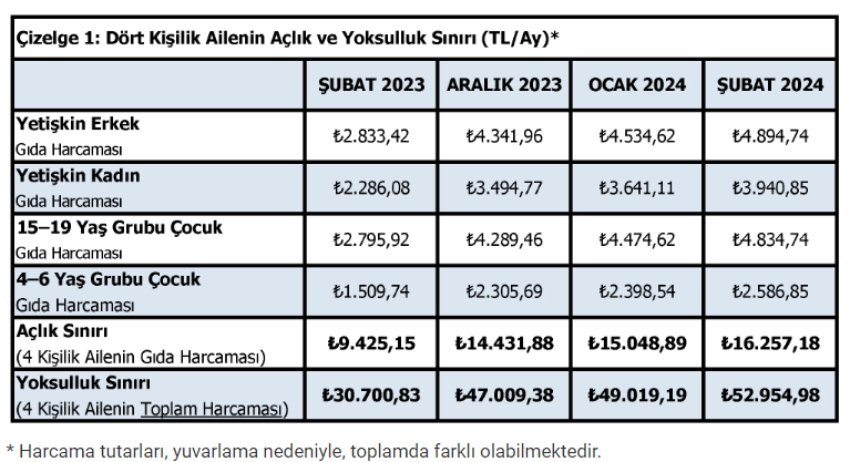 TÜRK-İŞ, şubat ayına ilişkin açlık ve yoksulluk sınırı araştırmasının sonuçlarını yayımladı. TÜRK-İŞ’in araştırmasına göre şubat ayında açlık sınırı 16 bin lirayı, yoksulluk sınırı ise 52 bin lirayı aştı. TÜRK-İŞ, açlık ve yoksulluk sınırı araştırmasının şubat ayı sonuçlarını açıkladı. 2024 yılının ikinci ayına ilişkin sonuçlarına göre Ankara’da yaşayan dört kişilik bir ailenin sağlıklı, dengeli ve yeterli beslenebilmesi için yapması gereken aylık gıda harcaması tutarı (açlık sınırı) 16.257 TL’ye yükseldi. Gıda harcaması ile giyim, konut (kira, elektrik, su, yakıt), ulaşım, eğitim, sağlık ve benzeri ihtiyaçlar için yapılması zorunlu diğer aylık harcamalarının toplam tutarı ise (yoksulluk sınırı) 52.955 TL’ye çıktı. Bekâr bir çalışanın yaşama maliyeti ise aylık 21.189 TL’ye yükseldi. Kaynak: Türk-İş Gıda enflasyonu 5 ayın zirvesinde TÜRK-İŞ’ in verilerine göre “gıda enflasyonu” verilerindeki değişim ise Şubat 2024’te şöyle oldu: 📌 Ankara’da yaşayan dört kişilik bir ailenin “gıda için” yapması gereken asgari harcama tutarındaki artış bir önceki aya göre %8,03 oranında gerçekleşti. 📌 Yılın ilk iki ayı itibarıyla artış oranı %12,64 oldu. 📌 Son on iki ay itibarıyla değişim oranı ise %72,49 olarak hesaplandı. 📌Yıllık ortalama artış ise %77,20 seviyesinde gerçekleşti. Veri böylelikle gıda enflasyonunda son beş ayın en yüksek seviyesine işaret etti. Kaynak: Türk-İş [news_id:719466]
