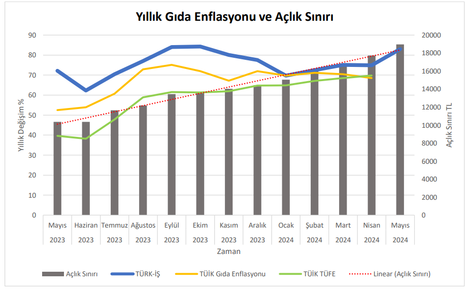 Türk-İş'in açlık ve yoksulluk sınırı araştırmasının sonuçları, asgari ücret ve açlık sınırı makasının mayısta açılmaya başladığını gösterdi. Türk-İş, açlık ve yoksulluk sınırı araştırmasının mayıs ayı sonuçlarını açıkladı. Türk-İş verilerine göre mayıs ayında Ankara’da yaşayan dört kişilik bir ailenin sağlıklı, dengeli ve yeterli beslenebilmesi için yapması gereken aylık gıda harcaması tutarı (açlık sınırı) 18.969,22 TL’ye yükseldi. Gıda harcaması ile giyim, konut (kira, elektrik, su, yakıt), ulaşım, eğitim, sağlık ve benzeri ihtiyaçlar için yapılması zorunlu diğer aylık harcamalarının toplam tutarı ise (yoksulluk sınırı) 61.788,99 TL’ye çıktı. Türk-İş’in hesaplamasına göre bekâr bir çalışanın ‘yaşama maliyeti’ de aylık 24.609,50 TL’ye yükseldi. Satın alma gücünün düşmeye devam ettiğinin belirtildiği raporda ise mutfak enflasyonunun aylık yüzde 7,02, 12 aylık yüzde 83,06, yıllık ise ortalama yüzde 79,43 olduğu hesaplandı. Kaynak: Türk-İş Türk-İş'in nisan ayı hesaplamasında açlık sınırı 17 bin 725 TL’ye çıkarak ilk kez asgari ücretin üzerine çıkmıştı. [news_id:731769] [news_id:734738]