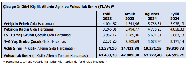 Türk-İş verilerine göre eylül ayında açlık sınırı 19 bin 830 TL'ye, yoksulluk sınırı da 64 bin 595 TL'ye yükseldi. Türk-İş, eylül ayı açlık ve yoksulluk sınırı araştırmasının sonuçlarını açıkladı. Buna göre Ankara’da yaşayan dört kişilik bir ailenin sağlıklı, dengeli ve yeterli beslenebilmesi için yapması gereken aylık gıda harcaması tutarını gösteren açlık sınırı 19 bin 271 TL'den 19 bin 830 TL'ye yükseldi. Böylelikle asgari ücret ile açlık sınırı arasındaki makas 2 bin 828 TL'ye çıkmış oldu. Gıda harcaması ile giyim, konut (kira, elektrik, su, yakıt), ulaşım, eğitim, sağlık ve benzeri ihtiyaçlar için yapılması zorunlu diğer aylık harcamalarının toplam tutarını ifade eden yoksulluk sınırı ise 62 bin 772 TL'den 64 bin 595 TL'ye yükseldi. Bekar bir çalışanın yaşama maliyeti de aylık 24 bin 962 TL’den 25 bin 706 TL'ye çıktı. Kaynak: TÜRK-İŞ TÜRK-İŞ hesaplamasında temel alınan ve doğrudan piyasadan çarşı-pazar-market dolaşılarak derlenen gıda ürünleri fiyatlardaki değişim, harcama gruplarına göre Eylül 2024 itibarıyla şu şekilde oldu: "📌 Süt, yoğurt, peynir grubunda; Süt, yoğurt, peynir ürünlerinin bulunduğu bu grupta geçtiğimiz aya göre bir fiyat değişikliği tespit edilmedi. Rekabet gereği fiyatlar kontrollü olarak değişse de ortalama olarak aynı kaldığı gözlemlendi. 📌 Et, tavuk, balık, yumurta, kuru baklagiller, ürünlerinin bulunduğu grupta; Et fiyatları bu ay tavuk ürünleri dışında “kısmen de olsa” azaldı. Dana etinin kilogram fiyatında 26 TL, kuzu etinin kilogram fiyatında ise 12 TL azalış olduğu tespit edildi. Tavuk etinin fiyatı sabit kaldı. Avlanma yasağının sona ermesiyle birlikte balık ürünleri çeşitlendi. Palamut, hamsi, levrek, çupra gibi tezgâhlarda yaygın bulunan balık çeşitlerinin kilogram fiyatları 150 TL ile 450 TL arasında değişiklik göstermektedir. Genellikle okulların açılmasıyla artan yumurta fiyatları bu yıl da artış gösterdi. Kuru baklagiller grubunda nohut ve kırmızı mercimeğin kilogram fiyatlarında 2-3 liralık bir artış tespit edilirken diğer ürünlerin fiyatları sabit kaldı. 📌 Taze sebze-meyve grubunda; Taze meyve-sebze fiyatları bu ay mutfağa olumsuz yansıdı. Hesaplamada her zaman olduğu gibi gıda harcaması içinde günlük kullanımı yaygın olan mevsim ürünleri esas alındı. Her ay dikkatle takip edilen patates ve kuru soğan fiyatında bu ay bir değişiklik tespit edilmedi. Meyve fiyatlarında ortalamada 3 TL’lik bir artış tespit edilirken sebze fiyatlarında da ortalamada 10 TL’lik artış tespit edildi. Ortalama sebze (ana yemekleri tamamlayan maydanoz, kıvırcık vb. salata yeşillikleri dâhil değil) kg fiyatı 37,50 TL, ortalama meyve kg fiyatı 63,43 TL oldu. Hesaplamada -bu ay- 21’i sebze ve 11’i meyve olmak üzere toplam 32 üründeki fiyat değişimi dikkate alındı. Ortalama meyve-sebze kg fiyatı 1,56 TL artış göstererek 46,16 TL olarak tespit edildi (ana yemekleri tamamlayan maydanoz, kıvırcık gibi salata yeşillikleri bu hesaplamada “Ortalama MeyveSebze Fiyatı” na dâhil edilmektedir). 📌 Ekmek, pirinç, un, makarna, bulgur, irmik gibi ürünlerin bulunduğu grupta; En son Mayıs ayında gelen zam ile birlikte Ankara’da 200 gramı 10 TL olan ekmeğin fiyatında bu ay değişiklik görülmedi. Diğer ürünlerden pirinç, bulgur, makarna ve irmiğin fiyatında da değişiklik görülmedi. Un fiyatında bazı marketlerde ürün bazlı fiyat artışları tespit edildi fakat ortalamada un fiyatları da sabit kaldı. 📌 Temel yağ ürünlerinin bulunduğu grupta; Temel yağ ürünlerinin bulunduğu bu grupta; ayçiçek yağının kilogram fiyatında 5 TL’lik artış tespit edildi. Diğer ürünlerden zeytinyağı, tereyağı ve margarin fiyatı sabit kaldı. Yeşil zeytin kilogram fiyatında 7 TL’lik artış tespit edilirken siyah zeytinin kilogram fiyatı ise 4 TL düştü. Yağlı tohum ürünlerinden sadece fındık fiyatında artış tespit edildi. 📌 Son grup içinde yer alan diğer gıda maddelerinden; Son grupta yer alan gıda maddelerinden baharat ürünleri(kimyon, nane, karabiber vb.) geçen ay olduğu gibi bu ay da artış gösterdi. Çay fiyatlarında marketler arası değişkenlik dikkat çekti fakat ortalamayı etkileyen bir değişiklik tespit edilmedi. Ihlamurda yeni mahsulün gelmesiyle birlikte ciddi bir fiyat artışı gerçekleşti. Diğer ürünlerden pekmezin fiyatında 3 TL’lik bir artış tespit edildi. Geçen ay kısmi miktarda artış gösteren bal ve şekerin fiyatı sabit kaldı. Fakat reçel fiyatı düştü. Tuz ve salça fiyatları geçen ay olduğu gibi bu ay da sabit kaldı.” Kaynak: TÜRK-İŞ