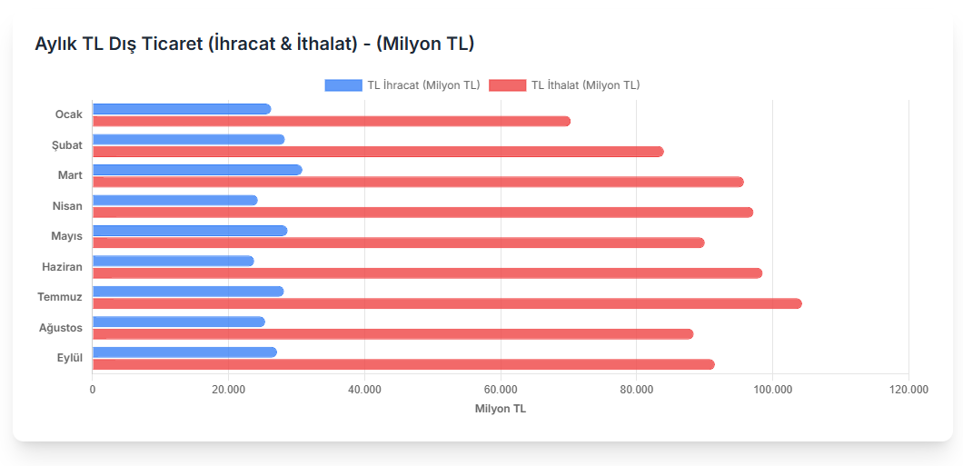 Türk lirasıyla dış ticaret, yılın 9 ayında geçen yılın aynı dönemine göre yüzde 33 artarak 1 trilyon 63 milyar 25 milyon lirayla rekor seviyeye ulaştı. Ticaret Bakanlığı verilerinden yaptığı derlemeye göre, ocak-eylül döneminde Türkiye'nin ihracatı geçen yılın aynı dönemine kıyasla yüzde 4,1 artarak 200,6 milyar dolara çıktı. Türkiye'nin ihracatındaki güçlü seyir, Türk lirasıyla yapılan dış ticarete de yansıdı. Türk lirasıyla ihracat, ocakta geçen yılın aynı ayına kıyasla yüzde 20,4 artarak 26 milyar 302 milyon lirayı buldu. İthalat da yüzde 47,2 artışla 70 milyar 319 milyon liraya çıktı. Böylece, yılın ilk ayında Türk lirasıyla dış ticaret 96 milyar 621 milyon lira oldu. Yılın ikinci ayında da yerel para birimiyle ihracat geçen yılın şubat ayına göre yüzde 12,4 artışla 28 milyar 291 milyon liraya, ithalat yüzde 19,2 yükselişle 84 milyar 18 milyon liraya ulaştı. Şubat'ta Türk lirasıyla dış ticaret hacmi 112 milyar 309 milyon lirayı aştı. Türk lirasıyla ihracat martta 2024'ün aynı ayına kıyasla yüzde 17,2 artarak 30 milyar 870 milyon liraya çıkarken, ithalat da yüzde 45,7 yükseldi. Martta, 95 milyar 769 milyon liralık ithalat yapıldı. Böylece martta Türk lirasıyla dış ticaret hacmi 126 milyar 639 milyon lira oldu. İhracat nisanda geçen yılın aynı ayına göre yüzde 9,1 artışla 24 milyar 312 milyon lirayı bulurken, ithalat da yüzde 53,5 yükselişle 97 milyar 193 milyon liraya çıktı. Söz konusu ayda dış ticaret hacmi 121 milyar 505 milyon lira olarak hesaplandı. Türk lirasıyla ihracat mayısta da 2024'ün aynı ayına göre yüzde 3,3 artarak 28 milyar 702 milyon liraya, ithalat yüzde 35,5 artışla 90 milyar 20 milyon liraya yükseldi. Bu dönemde Türk lirasıyla 118 milyar 722 milyon liralık dış ticaret yapıldı. Kurban Bayramı'nın da kutlandığı haziran ayında Türk lirasıyla ihracat Haziran 2024'e kıyasla yüzde 11,6 artışla 23 milyar 774 milyon liraya, ithalat yüzde 61,6 yükselişle 98 milyar 537 milyon liraya çıktı. Böylece Türk lirasıyla dış ticaret hacmi, haziranda 122 milyar 311 milyon lirayı buldu. Türk lirasıyla ihracat temmuzda yıllık bazda yüzde 7,9 artışla 28 milyar 161 milyon lira, ithalat yüzde 51,4 yükselişle 104 milyar 332 milyon lira oldu. Bu ayda dış ticaret hacmi 132 milyar 493 milyon lira olarak kayıtlara geçti. Ağustos ayında Türk lirasıyla ihracat geçen yılın aynı ayıyla benzer seyir izleyerek 25 milyar 388 milyon lira oldu. İthalat ise yüzde 30,7 artışla 88 milyar 395 milyon liraya yükseldi. Ağustosta dış ticaret hacmi 113 milyar 782 milyon lira olarak gerçekleşti. İhracat eylülde yıllık bazda yüzde 4,8 artışla 27 milyar 144 milyon liraya, ithalat da yüzde 38,3 artışla 91 milyar 499 milyon liraya çıktı. Böylece geçen ay Türk lirasıyla dış ticaret 118 milyar 643 milyon lirayı buldu. 165 ülkeye Türk lirasıyla ihracat Türk lirasıyla ihracat, bu yılın ocak-eylül döneminde geçen yılın aynı dönemine göre yüzde 9,4 artışla 222 milyar 113 milyon liradan 242 milyar 944 milyon liraya çıktı. İthalat da aynı dönemde yüzde 42 yükselişle 577 milyar 436 milyon liradan 820 milyar 80 milyon liraya ulaştı. Böylece, yılın 9 ayında dış ticaret hacmi, yüzde 33 artışla 799 milyar 550 milyon liradan 1 trilyon 63 milyar 25 milyon liraya yükseldi. Bu veri, 9 aylık dönemler dikkate alındığında rekor olarak kayıtlara geçti. Eylülde 165 ülkeye Türk lirasıyla ihracat yapılırken, 30 bin 668 firma dış satımında yerel para birimini kullandı.