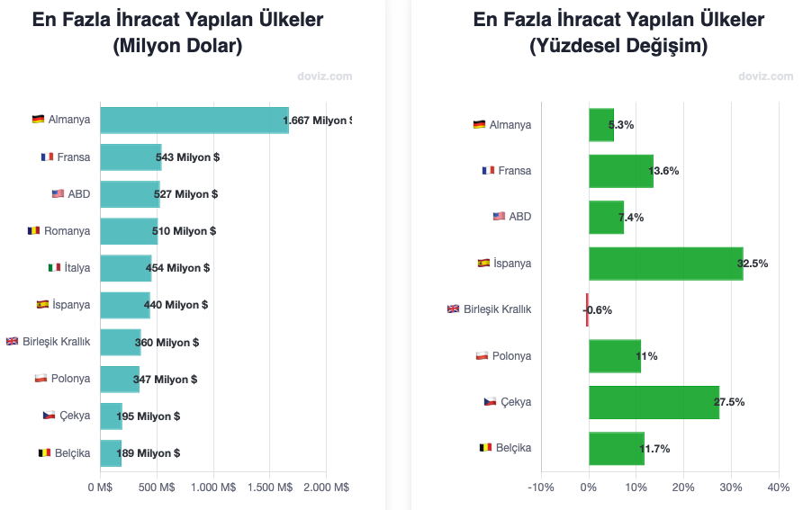 Türkiye, 2025 yılının ilk altı ayında otomotiv ihracatında dikkat çekici bir performans sergiledi. Toplam 19 milyar 985 milyon 534 bin dolarlık otomotiv dış satımının yüzde 38,4’ünü oluşturan yan sanayi ihracatı, 202 ülkeye ulaşılarak 7 milyar 679 milyon 202 bin dolara taşındı. Uludağ Otomotiv Endüstrisi İhracatçıları Birliği (OİB) verilerine göre, Türkiye'nin en fazla otomotiv yan sanayi ihraç ettiği ülke 1 milyar 666 milyon 660 bin dolarla Almanya oldu. Bu rakam, geçen yılın aynı dönemine göre yüzde 5,3 artış anlamına geldi. İkinci sırada yer alan Fransa’ya gönderilen ürün miktarı ise yüzde 13,6’lık artışla 542 milyon 507 bin dolara çıktı. Üçüncü sıradaki ABD’ye yapılan dış satım, 490 milyon 785 bin dolardan 527 milyon 98 bin dolara yükseldi. 'Avrupa'dan çifte sıçrayış: İspanya ve Çekya dikkat çekti' Romanya 509 milyon 621 bin dolarlık dış satımla dördüncü sırada yer aldı. İtalya’ya yapılan ihracat 454 milyon 73 bin dolara ulaşarak beşinci sıraya yerleşti. Bu ülkeleri, İspanya 440 milyon 216 bin dolar, Birleşik Krallık 359 milyon 656 bin dolar, Polonya 346 milyon 930 bin dolar, Çekya 194 milyon 591 bin dolar ve Belçika 188 milyon 761 bin dolarla izledi. İspanya’ya ihracatta geçen yılın aynı dönemine göre yüzde 32,5’lik artış görülürken, Çekya’da ise yüzde 27,5’lik bir yükseliş yaşandı. '202’nci ülke: Cayman Adaları’na 54 dolarlık satış yapıldı' İlk 10 ülkeye toplamda 5 milyar 230 milyon 117 bin dolarlık otomotiv yan sanayi ihracatı yapılırken, kalan 192 ülkeye gerçekleştirilen ihracat 2 milyar 449 milyon 89 bin dolar oldu. Verilere göre, Türkiye'den otomotiv yan sanayi ürünü alan son ülke Cayman Adaları oldu ve bu ülkeye sadece 54 dolarlık ürün gönderildi.