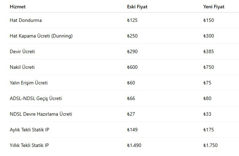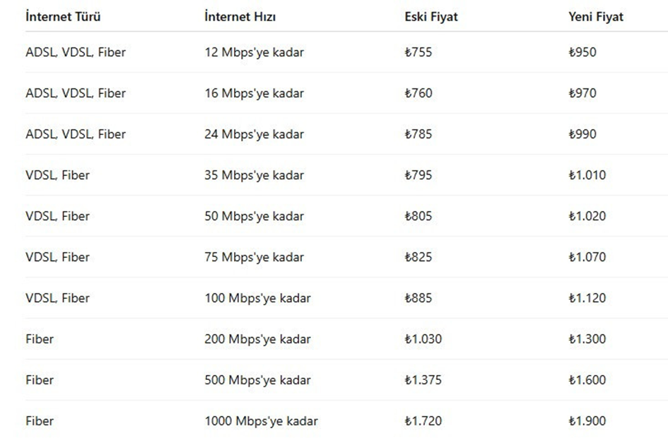 Türk Telekom, 1 Temmuz 2025 tarihinden itibaren geçerli olmak üzere tarife fiyatlarına ortalama yüzde 20 zam yapacağını duyurdu. İşte zammın ardından oluşacak yeni fiyat listesi... Türk Telekom, 1 Temmuz 2025 itibarıyla internet fiyatlarına zam yapacağını açıkladı. Kurumdan yapılan açıklamaya göre zam oranı ortalama yüzde 20 olacak. Düşük hızlarda yüzde 27’ye varan zamlar yapılırken 1.000 Mbps tarifede yüzde 10 oranında zam gerçekleşecek. Taahhütlü ve taahhütsüz paketlerde fiyatlar yükselirken, mevcut taahhüt süresi devam eden müşterilerin ücretlerinde değişiklik olmayacak. Ancak taahhüt yenilemek isteyenler zamlı fiyatlardan etkilenecek. Taahhüt bitmeden aboneliğini sonlandıranlara da zamlı fiyatlar üzerinden cayma bedeli uygulanacak. Kaynak: Türk Telekom