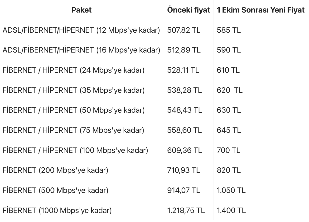 Türk Telekom, internet abonelik fiyatlarına 1 Ekim’den itibaren zam geleceğini duyurdu. Zammın ardından en ucuz abonelik paketinin ise 585 liradan başlayacağı bildirildi. Türk Telekom, 1 Ekim itibariyle paket fiyatlarında yeni bir güncelleme yapılacağını açıkladı. Yapılan açıklamaya göre bireysel ve kurumsal internet ücretlerine 200 liraya kadar zam gelecek. En ucuz paket 585 liradan başlayacak. Öte yandan gerçekleştirilen zam, taahhüdü bulunan abonelikleri kapsamayacak. Konuya ilişkin Türk Telekom'dan yapılan açıklamada, "1 Ekim 2023 tarihinden itibaren; Evde/İşte İnternet tarifelerinin liste fiyatı, Yalın/Alo erişim liste fiyatı ve Alo dakika paketlerinin liste fiyatı, Statik IP liste fiyatı ve Tek Seferlik İşlem ücretlerinde (devir, hat dondurma, hat kapama) güncelleme yapılacaktır. Bahse konu liste fiyatı güncellemelerinden, sadece taahhütsüz durumda olan müşterilerimiz etkilenecek olup, taahhütlü müşterilerimiz taahhüt süreleri boyunca herhangi bir fiyat değişikliğinden etkilenmeyecektir. Taahhütsüz müşterilerimiz de avantajlı kampanyalarımıza katılarak hiçbir fiyat değişikliğinden etkilenmeden kullanımlarına devam edebilirler" ifadelerine yer verildi. Yeni zamlı tarifeler ise şu şekilde listelendi: