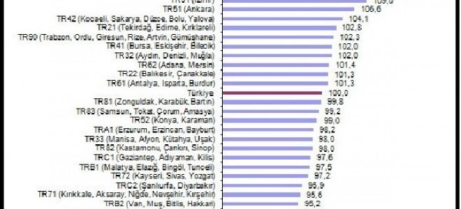 İstanbul, 19 Mart (DHA) - Türkiye’nin, 2017 yılı sonuçlarına göre, fiyat düzeyi endeksi en yüksek bölgesi 114.8 ile İstanbul, en düşük bölgesi ise 93.5 ile Ağrı, Kars, Iğdır, Ardahan oldu. Türkiye İstatistik Kurumu (TÜİK) verilerine göre, bu endeks değerleri, İstanbul'un Türkiye ortalamasına göre yüzde 14.8 pahalı, Ağrı, Kars, Iğdır, Ardahan'ın ise yüzde 6.5 daha ucuz olduğunu gösteriyor. TÜİK'in Bölgesel Satınalma Gücü Paritesi (BSGP) 2017 çalışması; Türkiye’nin çeşitli bölgelerinde Türk Lirası (TL)’nın satın alma gücündeki farklılıkların belirlenmesi amacı ile gerçekleştirildi. Çalışmada, ayrıntılı olarak tanımlanmış ortak bir mal ve hizmet sepeti kullanılarak bölgesel fiyat düzeyi endeksleri elde edildi. İstatistiki Bölge Birimleri Sınıflaması (İBBS) 2. Düzey detayında üretilen endeksler ile farklı bölgelerdeki fiyat düzeylerinin karşılaştırılmasına imkan sağlandı. Bir bölgenin fiyat düzeyi endeksi, 100’den büyük ise bu bölge Türkiye ortalamasına göre "pahalı" ve 100’den küçük ise bu bölge Türkiye ortalamasına göre "ucuz" oluyor. TÜİK verilerine göre; gıda ve alkolsüz içecekler ana grubunda en pahalı bölge İstanbul oldu. Gıda ve alkolsüz içecekler ana grubunda en yüksek fiyat düzeyi endeksi 111,0 ile İstanbul'da gerçekleşti. Aynı ana grup için fiyat düzeyi endeksi en düşük olan bölge 94.9 ile Şanlıurfa, Diyarbakır oldu. Giyim ve ayakkabı ana grubunda en yüksek fiyat düzeyi endeksi 110.6 ile İzmir’de gerçekleşti. Aynı ana grup için fiyat düzeyi endeksi en düşük olan bölge 84.1 ile Ağrı, Kars, Iğdır, Ardahan oldu. Konut ana grubunda en yüksek fiyat düzeyi endeksi 150.1 ile İstanbul'da gerçekleşti. Aynı ana grup için fiyat düzeyi endeksi en düşük olan bölge 84.5 ile Mardin, Batman, Şırnak, Siirt oldu. Ulaştırma ana grubunda en yüksek fiyat düzeyi endeksi 107.1 ile İzmir'de gerçekleşti. Aynı ana grup için fiyat düzeyi endeksi en düşük olan bölge 93.5 ile Şanlıurfa, Diyarbakır oldu. Lokanta ve oteller ana grubunda en yüksek fiyat düzeyi endeksi 118.3 ile Ankara'da gerçekleşti. Aynı ana grup için fiyat düzeyi endeksi en düşük olan bölge 91.7 ile Hatay, Kahramanmaraş, Osmaniye oldu. Dağılım genişliği en az olan ana gruplardan birisi alkollü içecekler ve tütün ana grubudur. Bu ana grupta en yüksek fiyat düzeyi endeksi 100.2 ile Şanlıurfa, Diyarbakır'da gerçekleşti. En düşük fiyat düzeyi endeksi 99.8 ile Aydın, Denizli, Muğla bölgesinde oldu. Ev eşyası ana grubunda en yüksek fiyat düzeyi endeksi 108.7 ile İzmir'de gerçekleşti. Aynı ana grup için fiyat düzeyi endeksi en düşük olan bölge 89.5 ile Hatay, Kahramanmaraş, Osmaniye oldu. Sağlık ana grubunda en yüksek fiyat düzeyi endeksi 145.3 ile Ankara'da gerçekleşti. Aynı ana grup için fiyat düzeyi endeksi en düşük olan bölge 73.8 ile Mardin, Batman, Şırnak, Siirt oldu. Eğlence ve kültür ana grubunda en yüksek fiyat düzeyi endeksi 106.6 ile İstanbul'da gerçekleşti. Aynı ana grup için fiyat düzeyi endeksi en düşük olan bölge 94.9 ile Mardin, Batman, Şırnak, Siirt oldu. Eğitim ana grubunda en yüksek fiyat düzeyi 141.7 ile İstanbul)’da gerçekleşti. Aynı ana grup için fiyat düzeyi endeksi en düşük olan bölge 76.9 ile Şanlıurfa, Diyarbakır oldu. Çeşitli mal ve hizmetler ana grubunda en yüksek fiyat düzeyi endeksi 110.1 ile İstanbul'da gerçekleşti. Aynı ana grup için fiyat düzeyi endeksi en düşük olan bölge 91.1 ile Ağrı, Kars, Iğdır, Ardahan oldu. Haberleşme ana grubunda değişim gözlenmemesinin nedeni, bu gruptaki telefon görüşme ve internet abonelik ücreti gibi tüm madde çeşidi fiyatlarının bütün bölgelerde aynı olmasıdır.