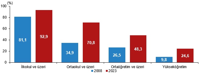 Türkiye'de ortalama eğitim süresi 2023'te 9,3 yıl olurken, yükseköğretim mezunlarının oranı 25 yaş ve üzeri nüfusta yüzde 24,6'ya çıktı. Türkiye İstatistik Kurumu (TÜİK), 2023 yılı ulusal eğitim istatistiklerini yayınladı. Buna göre, 25 yaş ve üzerindeki ön lisans, lisans, yüksek lisans ve doktora mezunlarının 25 yaş ve üzeri toplam nüfus içindeki oranı 2008'de yüzde 9,8 iken geçen yıl yüzde 24,6 oldu. Söz konusu yaş grubu içindeki ilkokul ve üzeri eğitim seviyelerinden mezun olanların oranı ise 2008'de yüzde 26,5 iken 2023'te yüzde 48,3 olarak hesaplandı. Kaynak: TÜİK 25 yaş ve üzeri nüfusun ortalama eğitim süresi 2011'de 7,3 yıl iken, 2023'te 9,3 yıla çıktı. Bu süre 2022 yılında 9,2 yıl olarak hesaplanmıştı. Ortalama eğitim süresi 2023 yılı için kadınlarda 8,6 yıl, erkeklerde 10,1 yıl olarak kayıtlara geçti. Ortalama eğitim süresi en yüksek il Ankara 25 yaş ve üzeri nüfusun ortalama eğitim süresinin 2023'te en yüksek olduğu il 10,7 yılla Ankara oldu. Başkenti sırasıyla İstanbul, Eskişehir, Kocaeli ve İzmir takip etti. Ortalama eğitim süresinin en düşük olduğu il ise 7,4 yılla Ağrı olarak belirlendi. Söz konusu ili Şanlıurfa, Muş, Kastamonu ve Van izledi. 25 yaş ve üzeri nüfusun ortalama eğitim süresinin 2014-2023 yıllarında en yüksek artış gösterdiği ilk 5 il, yüzde 54,1 ile Şırnak, yüzde 46,2 ile Hakkari, yüzde 40,8 ile Muş, yüzde 40,5 ile Bingöl ve Siirt olarak sıralandı. En düşük artış gösteren ilk 5 il ise yüzde 14,6 ile Ankara, yüzde 16,2 ile Eskişehir, yüzde 16,3 ile Tekirdağ, yüzde 17 ile İzmir ve yüzde 17,1 ile Yalova oldu. Kaynak: TÜİK 2008'de 6 yaş ve üzeri nüfusta okuma yazma bilenlerin oranı yüzde 91,8 iken, 2023'te yüzde 97,6 olarak hesaplandı. 2008-2023 yıllarında kadınlarda okuma yazma bilenlerin oranı yüzde 86,9'dan yüzde 96'ya, erkeklerde ise yüzde 96,7'den yüzde 99,2'ye çıktı. Annesi yükseköğretim mezunu olan fertlerin yüzde 84,6'sı yükseköğretimi okudu 25 yaş ve üzeri nüfusta, annesi yükseköğretim mezunu olan fertlerin yüzde 84,6'sının yükseköğretim, yüzde 12,5'inin ortaöğretim ve yüzde 2,9'unun ortaöğretim altı eğitim düzeyini tamamladığı belirlendi. Söz konusu nüfusta, babası yükseköğretim mezunu olan fertlerin yüzde 80,2'sinin yükseköğretim, yüzde 16'sının ortaöğretim ve yüzde 3,8'inin ortaöğretim altı eğitim düzeyini tamamladığı görüldü. 25 yaş ve üzeri nüfusta, annesi ortaöğretim mezunu olan fertlerin yüzde 64,3'ünün, babası ortaöğretim mezunu olan fertlerin yüzde 55,4'ünün yükseköğretim mezunu olduğu kaydedildi. Annesi ortaöğretim altı eğitim düzeyini tamamlayan fertlerin yüzde 27,9'unun, babası ortaöğretim altı eğitim düzeyini tamamlayan fertlerin yüzde 26,6'sının yükseköğretim mezunu olduğu belirlendi.