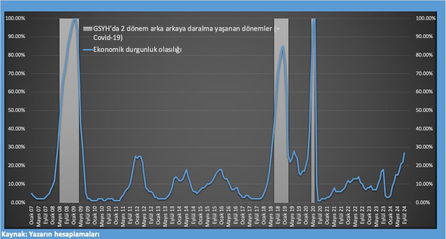 Doç. Dr. Cem Çakmaklı, hazırladıkları resesyon göstergelerinin henüz sınırdan uzak olsa da Türkiye ekonomisine ilişkin alarm verdiğini söyledi. Buna göre göstergenin son yıllarda hesaplanan en yüksek değere ulaştığını belirten Çakmaklı, ekim ayında artışın devam edebileceğini söyledi. Koç Üniversitesi’nden Doç. Dr. Cem Çakmaklı, Prof. Dr. Selva Demiralp ve Doç. Dr. Sevcan Yeşiltaş ile birlikte hazırladıkları, Türkiye Ekonomisinin resesyona girme olasılığı hesaplamasının alarm verdiğini belirtti. Çakmaklı, geçen günlerde de katıldığı CNBC-e yayınında, "Türkiye ekonomisinde resesyon ihtimali kesinlikle var" derken, henüz dezenflasyon sürecine girilmediğini ve bu ortamda Merkez Bankası'nın faiz indirimini 2025 yılında yapmasını beklediğini belirtmişti. Çakmaklı, konuyla ilgili sosyal medya notunda ise henüz kritik eşikten uzak görünse de Türkiye ekonomisinin resesyona yönelik alarm verdiğini belirtti. Buna göre Çakmaklı’nın paylaşımı şöyle oldu: “Resesyon alarmı!!! Son verileri kullanarak hesapladığımız Türkiye Ekonomisinin resesyona girme olasılığını Eylül'de %27 olarak hesapladık. Henüz kritik eşik %50'den uzak ama son yıllarda hesapladığımız en yüksek olasılık. Ekim'de daha da artış olacağını bekliyoruz.” Kaynak: Cem Çakmaklı - X [article_id:80]