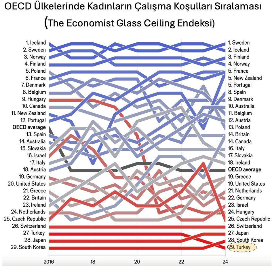 Türkiye, The Economist tarafından hazırlanan endekse göre kadınların iş gücüne katılımı ve iş yerindeki eşitliği konusunda 29 OECD ülkesi arasında son sıraya geriledi. Ekonomist Prof. Dr. Hakan Kara, sosyal medya platformu X üzerinden yaptığı açıklamada, Türkiye’nin kadınların çalışma koşulları açısından OECD ülkeleri arasında en son sıraya gerilediğini duyurdu. Kara paylaşımında, “29 OECD ülkesi içinde kadınların çalışma koşulları sıralamasında son sıraya düştük. 10 yıldır ilk üçte İskandinav, son üçte Asya ülkeleri yer alıyordu” ifadelerine yer verdi. İlgili sıralamada referans gösterilen veriler, The Economist tarafından her yıl hazırlanan ve kadınların iş hayatındaki durumlarını çok boyutlu olarak ele alan bir endekse dayandırıldı. Endeks hangi kriterlere göre hazırlanıyor? Endeks, ülkeleri kadınların iş gücüne katılım oranı, ücret eşitliği, kadınların üst düzey yönetim pozisyonlarındaki temsili ve çocuk bakım hizmetlerinin erişilebilirliği gibi temel göstergeler ışığında değerlendirdi. Bu kapsamda kadınların hem iş hayatına katılım oranı hem de çalışma koşullarındaki eşitlik düzeyi analiz edildi. Endekste bu yıl da İsveç, Norveç ve Finlandiya gibi İskandinav ülkeleri en üst sıralarda yer aldı. Kadınların hem iş gücüne yüksek oranda katıldığı hem de yönetici pozisyonlarda güçlü şekilde temsil edildiği bu ülkeler, aynı zamanda aile dostu sosyal politikalar ve erişilebilir kreş hizmetleriyle öne çıktı. Buna karşın Türkiye, Japonya ve Güney Kore ile birlikte listenin en alt sıralarında yer aldı. Özellikle kadınların iş gücüne katılım oranının düşüklüğü, ücret eşitsizliği ve üst düzey pozisyonlardaki temsil oranının zayıf olması Türkiye’nin sıralamadaki yerini olumsuz etkiledi. Kaynak: Hakan Kara [news_id:762741]