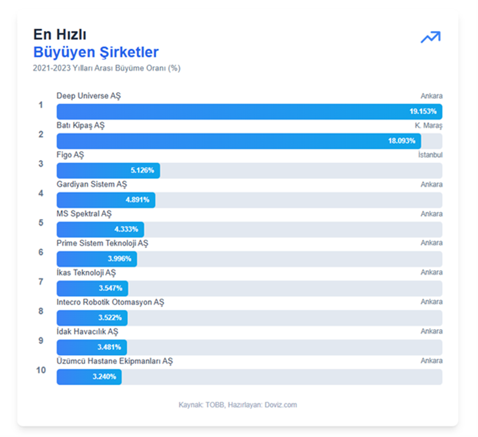 2021-2023 arasında ülkenin en hızlı büyüyen şirketleri açıklandı. Bu dönemde en hızlı büyüyen ilk 10 şirketin 8’inin Ankara’dan çıktığı görüldü. TOBB öncülüğünde, TEPAV ve TOBB ETÜ işbirliği ile şirketlerin 2021-2023 arası iki yıllık ciro artışı dikkate alınarak yapılan Türkiye’nin en hızlı büyüyen 100 şirketi yarışması sonuçlandı. İlk 100’deki şirketler, Türkiye’den 6 kat daha hızlı büyüdü. TOBB Başkanı M. Rifat Hisarcıklıoğlu, törende yaptığı konuşmada, söz konusu dönemde Türkiye'nin en hızlı büyüyen 100 şirketinin ortalama ciro büyümesinin yüzde 1644 olduğunu söyledi. Bu şirketlerin Türkiye'deki milli gelir artışının 6 kat üzerinde performans gösterdiklerini vurgulayan Hisarcıklıoğlu, "Yine aynı süre içinde, çalışan başı üretimlerini yani verimliliklerini ise ortalama yüzde 718 artırdılar. Ayrıca her biri ortalama 127 kişiye istihdam sağladı. Toplam istihdamlarını da yüzde 88 oranında artırdılar. Türkiye 100 şirketlerinin yüzde 67’si ihracat yapıyor. Tam 67 ülkeye ihracat gerçekleştiriyorlar" diye konuştu. İlk sıra Deeptech Universe Savunma ve Bilişim Teknolojileri AŞ'nin oldu Cirosunu iki yılda yüzde 19 bin 153 oranında artıran Ankara merkezli Deeptech Universe Savunma ve Bilişim Teknolojileri AŞ ilk sırayı aldı. Kahramanmaraş firması Batı Kipaş Kağıt Sanayi ve Ticaret A.Ş. yüzde 18 bin 93 büyüme oranıyla ikinci, İstanbul merkezli Figo Ticari Bilgi ve Uygulama Platformu A.Ş. ise yüzde 5 bin 126 büyüme oranıyla üçüncü oldu. En hızlı büyüyen 10 şirketin 8’inin Ankara merkezli olması dikkat çekti. En hızlı büyüyen 10 şirket ise şunlar oldu: En fazla Ankara'daki şirketler yer aldı Listede 25 farklı ilden, 34 farklı sektöre ait şirket bulunurken en fazla yoğunluk, bilgisayar programlama ve danışmanlık alanında görüldü. En hızlı büyüyen şirketlerin 24’ü Ankara’dan, 22’si İstanbul’dan çıktı. Bunları 6’şar şirket ile Balıkesir ve İzmir takip etti. Konya 5 firma ile öne çıktı. Adana ve Bursa’dan 4’er firma yer alırken, Antalya, Eskişehir, Kayseri, Kocaeli ve Mersin’den 3’er firma listede temsil edildi. Sakarya’dan 2 firma bulunuyor. Bolu, Denizli, Düzce, Elazığ, Gaziantep, Kahramanmaraş, Kastamonu, Mardin, Ordu, Samsun, Sivas ve Tekirdağ’dan ise 1’er firma listeye girdi.