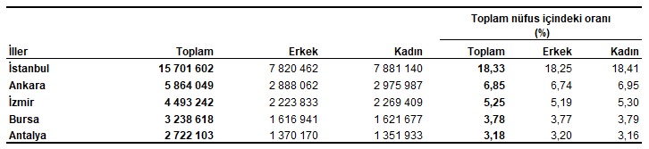Türkiye'de ikamet eden kişi sayısı 31 Aralık 2024 tarihi itibarıyla bir önceki yıla göre 292 bin 567 kişi artarak 85 milyon 664 bin 944 oldu. Türkiye İstatistik Kurumu, 2024 nüfus verilerini açıkladı. Türkiye'de ikamet eden nüfus, 31 Aralık 2024 tarihi itibarıyla bir önceki yıla göre 292 bin 567 kişi artarak 85 milyon 664 bin 944 kişi oldu. Bu dönemde erkek nüfus 42 milyon 853 bin 110 kişi olurken, kadın nüfus 42 milyon 811 bin 834 kişi olarak kayıtlara geçti. Adrese Dayalı Nüfus Kayıt Sistemi (ADNKS) sonuçlarına göre, ülkemizde ikamet eden yabancı nüfus bir önceki yıla göre 89 bin 996 kişi azalarak 1 milyon 480 bin 547 kişi oldu. Bu nüfusun %48,3'ünü erkekler, %51,7'sini kadınlar oluşturdu. Nüfus artış hızı binde 3,4'e çıktı Yıllık nüfus artış hızı 2023 yılında binde 1,1 iken, 2024 yılında binde 3,4 oldu. Kaynak: TÜİK Türkiye'de 2023 yılında %93 olan il ve ilçe merkezlerinde yaşayanların oranı, 2024 yılında %93,4 oldu. Diğer yandan belde ve köylerde yaşayanların oranı %7'den %6,6'ya düştü. Türkiye'de 40 ilin nüfusu azaldı Ülkemizde 2023 yılında bir önceki yıla göre 10 ilin nüfusunda azalma görülürken, 2024 yılında 40 ilin nüfusunun azaldığı görüldü. İstanbul'un nüfusu, bir önceki yıla göre 45 bin 678 kişi artarak 15 milyon 701 bin 602 kişi oldu. Türkiye nüfusunun %18,3'ünün ikamet ettiği İstanbul'u, 5 milyon 864 bin 49 kişi ile Ankara, 4 milyon 493 bin 242 kişi ile İzmir, 3 milyon 238 bin 618 kişi ile Bursa ve 2 milyon 722 bin 103 kişi ile Antalya izledi. Kaynak: TÜİK Bayburt, 83 bin 676 kişi ile en az nüfusa sahip olan il oldu. Bayburt'u, 86 bin 612 kişi ile Tunceli, 91 bin 354 kişi ile Ardahan, 142 bin 617 kişi ile Gümüşhane ve 156 bin 739 kişi ile Kilis takip etti. Kaynak: TÜİK Türkiye nüfusunun ortanca yaşı 34,4'e yükseldi Türkiye'de 2023 yılında 34 olan ortanca yaş, 2024 yılında 34,4'e yükseldi. Cinsiyete göre incelendiğinde, ortanca yaşın erkeklerde 33,2'den 33,7'ye, kadınlarda ise 34,7'den 35,2'ye yükseldiği görüldü. Kaynak: TÜİK Ortanca yaşın illere göre dağılımına bakıldığında, Sinop'un 43,4 ile en yüksek ortanca yaş değerine sahip il olduğu görüldü. Sinop'u, 42,9 ile Giresun ve Kastamonu izledi. Diğer yandan 21,4 ile Şanlıurfa en düşük ortanca yaşa sahip il oldu. Şanlıurfa'yı, 23 ile Şırnak ve 24,5 ile Ağrı ve Siirt takip etti. Ortanca yaşın illere ve cinsiyete göre dağılımı incelendiğinde, erkeklerde 42,5 ile Sinop en yüksek ortanca yaşa sahip olan il olurken, 21 ile Şanlıurfa en düşük ortanca yaşa sahip olan il oldu. Kadınlarda 44,3 ile Sinop yine en yüksek ortanca yaş değerine sahip olan il olurken, Şanlıurfa 21,9 ile en düşük ortanca yaş değerine sahip olan il oldu. Kaynak: TÜİK Hiç evlenmeyenlerin oranı erkeklerde daha yüksek Ülkemizde 2009 ve 2024 yılı cinsiyete göre medeni durumun dağılımı incelendiğinde, erkeklerde hiç evlenmeyenlerin oranının kadınlara göre daha yüksek olduğu, kadınlarda ise eşi ölenlerin ve boşananların oranının erkeklerden daha fazla olduğu görüldü. Diğer yandan büyük çoğunluğu oluşturan evlilerin oranının 2009 ve 2024 yılında her iki cinsiyette de birbirine yakın oranlarda olduğu görüldü. Çalışma çağındaki nüfusun oranı %68,4 Çalışma çağı olarak tanımlanan 15-64 yaş grubundaki nüfusun oranı, 2007 yılında %66,5 iken 2024 yılında %68,4 oldu. Diğer yandan çocuk yaş grubu olarak tanımlanan 0-14 yaş grubundaki nüfusun oranı %26,4'ten %20,9'a gerilerken, 65 ve daha yukarı yaştaki nüfusun oranı ise %7,1'den %10,6'ya yükseldi. Türkiye'de kilometrekareye 111 kişi düşerken İstanbul'da 2 bin 934 kişi düştü Nüfus yoğunluğu olarak tanımlanan "bir kilometrekareye düşen kişi sayısı", Türkiye genelinde 111 kişi oldu. İstanbul, kilometrekareye düşen 2 bin 934 kişi ile nüfus yoğunluğu en yüksek olan ilimiz oldu. İstanbul'u 623 kişi ile Kocaeli ve 390 kişi ile en küçük yüz ölçümüne sahip il olan Yalova izledi. Nüfus yoğunluğu en az olan il ise bir önceki yılda olduğu gibi, kilometrekareye düşen 11 kişi ile Tunceli oldu. Tunceli'yi, 19 kişi ile Ardahan ve 21 kişi ile Erzincan ve Gümüşhane izledi. Diğer yandan yüz ölçümü büyüklüğünde ilk sırada yer alan Konya'nın nüfus yoğunluğu ise 59 olarak gerçekleşti. [news_id:741130]