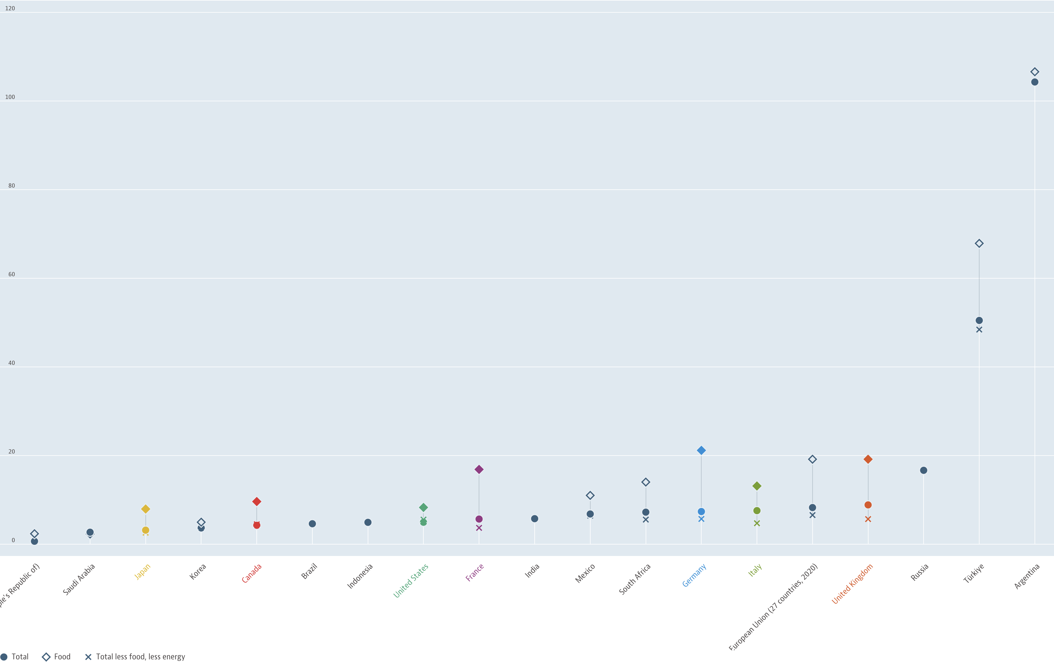 OECD'nin 4 mayısta güncellenen tablosunda tüketici fiyatlarının yıllık bazda yüzde 25,2 arttığı Macaristan ve yüzde 17,3 arttığı Letonya'nın önünde 38 ülke arasında Türkiye lider konumda "Tüketici Fiyatları" raporuna göre OECD ülkelerinde ortalama yıllık enflasyon martta yüzde 8,8'den yüzde 7,7'ye geriledi. Türkiye, TÜİK'in yüzde 50,5 olarak açıkladığı mart ayı tüketici enflasyonu verisiyle OECD ülkeleri arasında ilk sırada. OECD ülkeleri arasında yıllık tüketici enflasyonunun en düşük olduğu ülke yüzde 2,9 ile İsviçre oldu. Yüzde 3,2 enflasyon açıklayan Japonya ve yüzde 3,3 ile İspanya, ilk 3 sırayı tamamladı. G20 ülkeleri arasında Türkiye ikinci G20 ülkeleri arasında yıllık tüketici enflasyonu yüzde 8'den yüzde 6,9'a geriledi. Türkiye, enflasyonun yüzde 100'ün üzerinde olduğu Arjantin'den sonra en yüksek tüketici enflasyonu oranına sahip G20 ülkesi oldu. Euro Bölgesi'nde yıllık TÜFE, martta yüzde 8,5'ten yüzde 6,9'a geriledi.