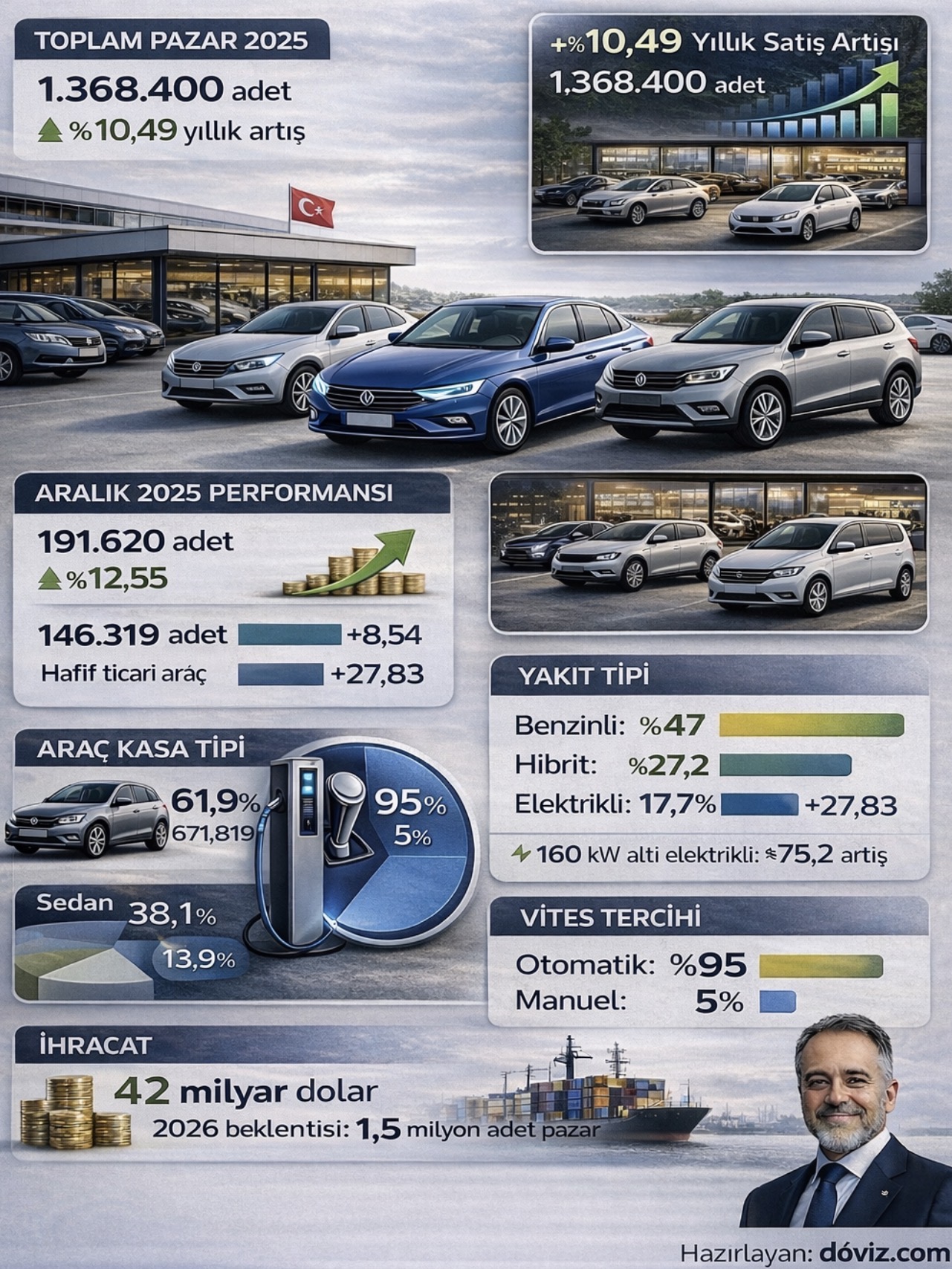 Türkiye otomobil ve hafif ticari araç pazarı 2025 yılında tarihi bir başarıya imza atarak tüm zamanların en yüksek satış rakamına ulaştı. Otomotiv Distribütörleri ve Mobilite Derneği tarafından paylaşılan verilere göre, 2025 yılı genelinde sıfır araç satışları bir önceki yıla kıyasla yüzde 10,49 oranında bir artış gösterdi. Bu dönemde toplam pazar 1 milyon 368 bin 400 adetlik satış rakamına ulaşarak yıllık bazda rekor kırdı. Ocak-aralık döneminde otomobil satışları yüzde 10,62 yükselerek 1 milyon 84 bin 496 adet seviyesine gelirken, hafif ticari araç satışları ise yüzde 9,97'lik bir artışla 283 bin 904 adet olarak kayıtlara geçti. Aralık ayında satış performansı ivme kazandı Yılın son ayında otomobil ve hafif ticari araç piyasasında hareketli bir seyir izlendi. Aralık ayında pazar, önceki yılın aynı dönemine göre yüzde 12,55 oranında büyüyerek 191 bin 620 adetlik hacme ulaştı. Bu ayda otomobil satışları yüzde 8,54 artışla 146 bin 319 olurken, hafif ticari araçlar tarafında yüzde 27,83 gibi yüksek bir büyüme oranıyla 45 bin 301 adetlik satış gerçekleşti. On yıllık aralık ayı ortalama satışları baz alındığında, toplam pazarın yüzde 57,9 oranında daha yüksek bir performans sergilediği görüldü. SUV tercihi pazarın lideri oldu Araç segmentleri ve gövde tipleri bazındaki dağılımda, düşük vergi oranlarına sahip A, B ve C segmentleri pazarın yüzde 82,7'sini domine etti. En fazla ilgi gören gövde tipi 671 bin 819 adetlik satış ve yüzde 61,9'luk pazar payı ile SUV modeller oldu. Yakıt türlerine göre bakıldığında ise benzinli otomobiller yüzde 47 ile ilk sıradaki yerini korurken, hibrit araçlar yüzde 27,2 ve tam elektrikli otomobiller yüzde 17,7 pay aldı. Özellikle 160 kW altındaki elektrikli araç satışlarının yüzde 75,2 oranında artması dikkat çekti. Şanzıman tercihlerinde otomatik vitesli araçlar yüzde 95'lik pay ile manuel vitese karşı büyük bir üstünlük kurdu. İhracat başarısı ve gelecek beklentileri ODMD Başkanı Ali Haydar Bozkurt, verileri değerlendirirken sektörün 2025 yılında 42 milyar dolarlık ihracat yaparak stratejik önemini kanıtladığını ifade etti. Heyecanlı bir yılın geride kaldığını belirten Bozkurt, gelecekte 1,5 milyon adetlik pazar seviyelerinin de görüleceğini dile getirdi. 2026 yılında da 2025 yılındaki pazar hacmine yakın bir büyüklük beklediklerini vurgulayan Bozkurt, yeni üretim yatırımları, artan ihracat ve büyüyen istihdam ile sektörün güçlenmeye devam etmesini beklediklerini söyledi.
