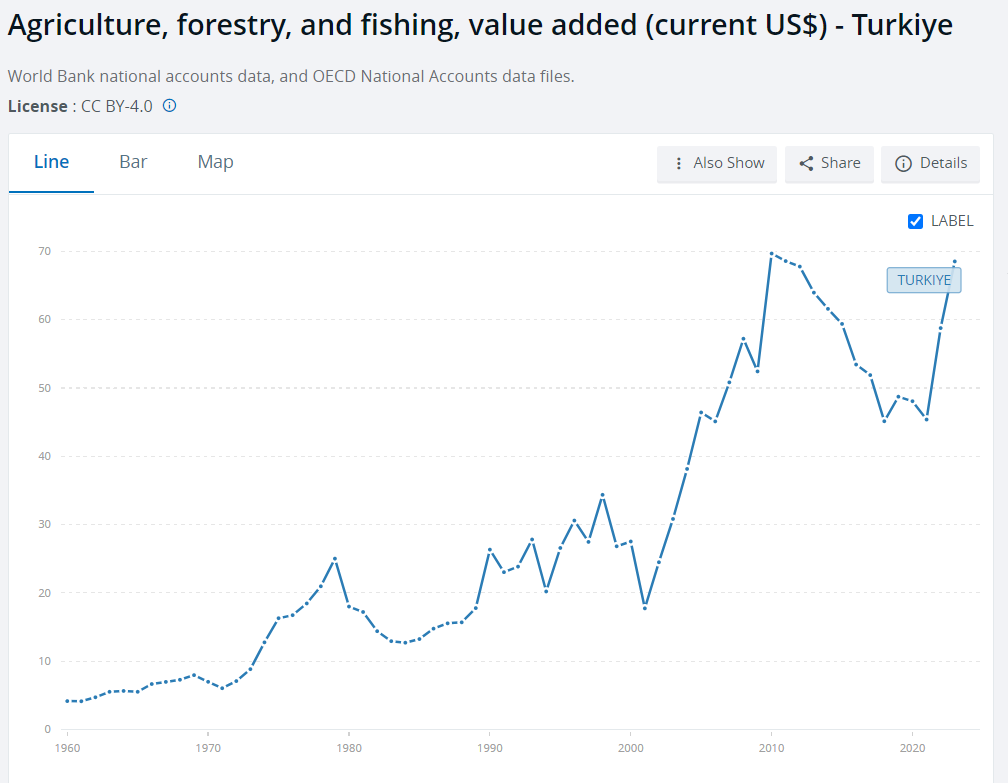 Tarım ve Orman Bakanı İbrahim Yumaklı, Türkiye'nin geçen yıl elde edilen 68,5 milyar dolarlık tarımsal hasılayla Avrupa'da birinci olduğunu, dünyada da ilk 10 ülke arasında yer aldığını bildirdi. Yumaklı, sosyal medya hesabından yaptığı paylaşımda, çiftçilerin Türkiye ekonomisine değer katmayı sürdürdüğünü ifade etti. Birleşmiş Milletler Gıda ve Tarım Örgütü (FAO) ile Dünya Bankasının verilerini aktaran Yumaklı, "Türkiye, 2023 yılında elde edilen 68,5 milyar dolarlık tarımsal hasıla ile Avrupa'da birinci, dünyada ise ilk 10 ülke arasında yer aldı. Bu başarıda emeği geçen tüm sektör paydaşlarımızı gönülden kutluyorum." ifadesini kullandı. Kaynak: WorldBank Söz konusu paylaşımda ayrıca Türkiye'nin 2023'te bir önceki yıla göre yüzde 16'lık tarımsal hasıla artışı elde ettiği bilgisine de yer verildi. Kaynak: İbrahim Yumaklı - X Dünya Bankası verilerine göre Türkiye'nin 64 yıllık dolar bazlı verileri ise şöyle listelendi: Kaynak: WorldBank