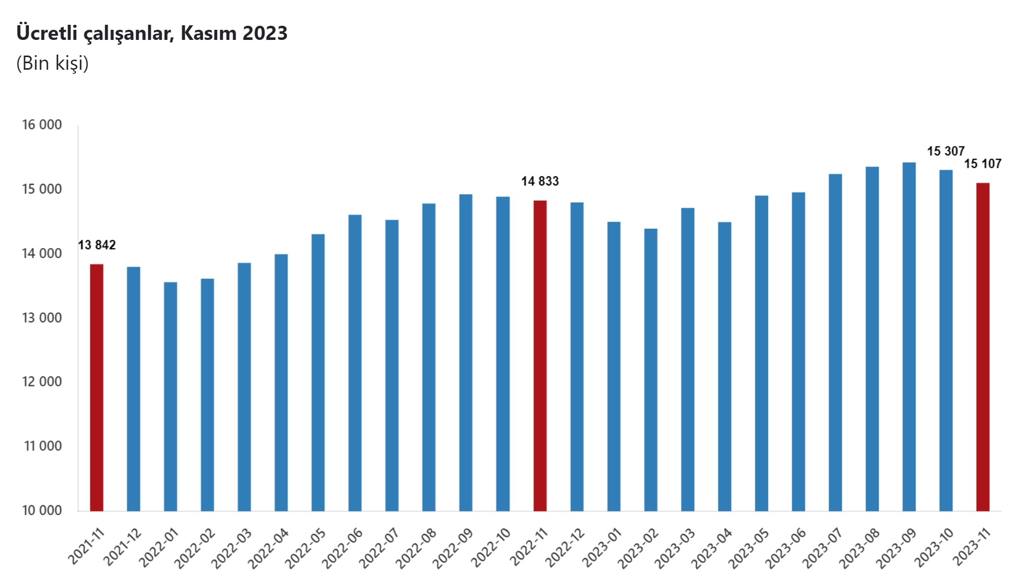 Sanayi, inşaat ve ticaret-hizmet sektörleri toplamında ücretli çalışan sayısı, Kasım 2023'te bir önceki yılın aynı ayına göre yüzde 1,8 artış gösterdi. Türkiye İstatistik Kurumu (TÜİK), Kasım 2023 dönemine ilişkin ücretli çalışan istatistiklerini açıkladı. Buna göre, Kasım 2022'de 14 milyon 833 bin 144 kişi olan sanayi, inşaat ve ticaret-hizmet sektörleri toplamında ücretli çalışan sayısı, Kasım 2023'de yıllık bazda yüzde 1,8 artışla 15 milyon 106 bin 556 kişiye yükseldi. Söz konusu ayda ücretli çalışan sayısı, sanayi sektöründe yıllık bazda yüzde 1,3 azaldı, inşaat sektöründe yüzde 10,2 ve ticaret-hizmet sektöründe yüzde 2,1 arttı. Aylık değişim Sanayi, inşaat ve ticaret-hizmet sektörleri toplamında ücretli çalışan sayısı Kasım 2023'de, bir önceki aya göre yüzde 0,2 azalış gösterdi. Bu dönemde ücretli çalışan sayısı sanayi sektöründe yüzde 0,5 azaldı, inşaat sektöründe yüzde 0,2 arttı ve ticaret-hizmet sektöründe ise değişim göstermedi. [news_id:720598]