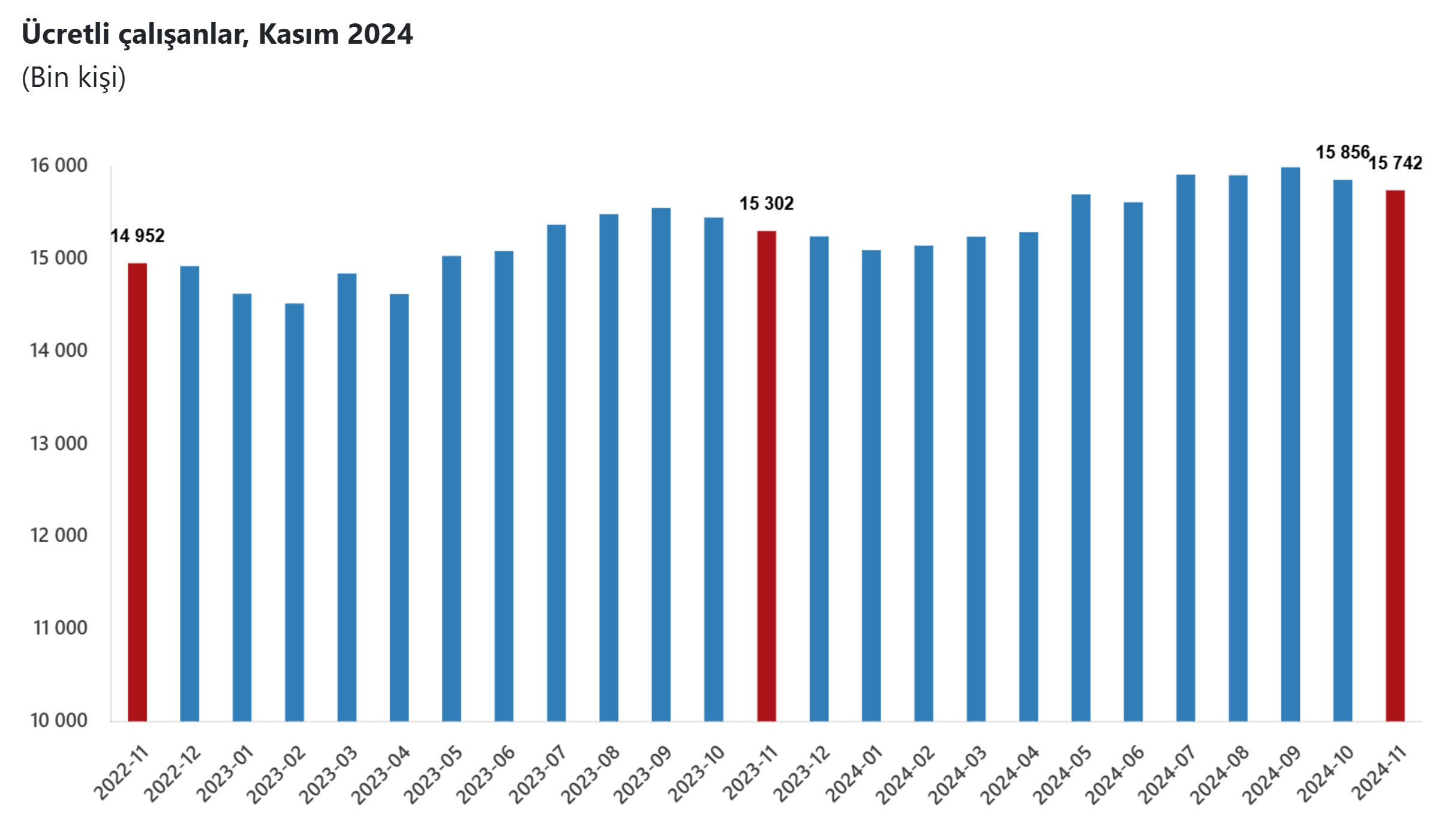TÜİK verilerine göre ücretli çalışan sayısı kasım ayında bir önceki yılın aynı ayına göre yüzde 2,9 artış gösterdi. Türkiye İstatistik Kurumu (TÜİK), Kasım 2024'e ilişkin ücretli çalışan istatistiklerini açıkladı. Sanayi, inşaat ve ticaret-hizmet sektörleri toplamında ücretli çalışan sayısı, Kasım 2024'te bir önceki yılın aynı ayına göre yüzde 2,9 artış gösterdi. Buna göre, Kasım 2023'te 15 milyon 301 bin 629 kişi olan sanayi, inşaat ve ticaret-hizmet sektörleri toplamında ücretli çalışan sayısı, Kasım 2024'te yıllık bazda yüzde 2,9 artışla 15 milyon 741 bin 665 kişiye yükseldi. Kaynak: TÜİK Söz konusu ayda ücretli çalışan sayısı, sanayi sektöründe yıllık bazda yüzde 0,7 azaldı, inşaat sektöründe yüzde 6,3 ve ticaret-hizmet sektöründe yüzde 4,3 arttı. Ücretli çalışan sayısı aylık yüzde 0,3 arttı Sanayi, inşaat ve ticaret-hizmet sektörleri toplamında ücretli çalışan sayısı Kasım 2024'te, bir önceki aya göre yüzde 0,3 artış gösterdi. Bu dönemde ücretli çalışan sayısı sanayi sektöründe değişim göstermezken, inşaat sektöründe yüzde 0,4, ticaret-hizmet sektöründe yüzde 0,5 artış kaydetti. [news_id:759192]