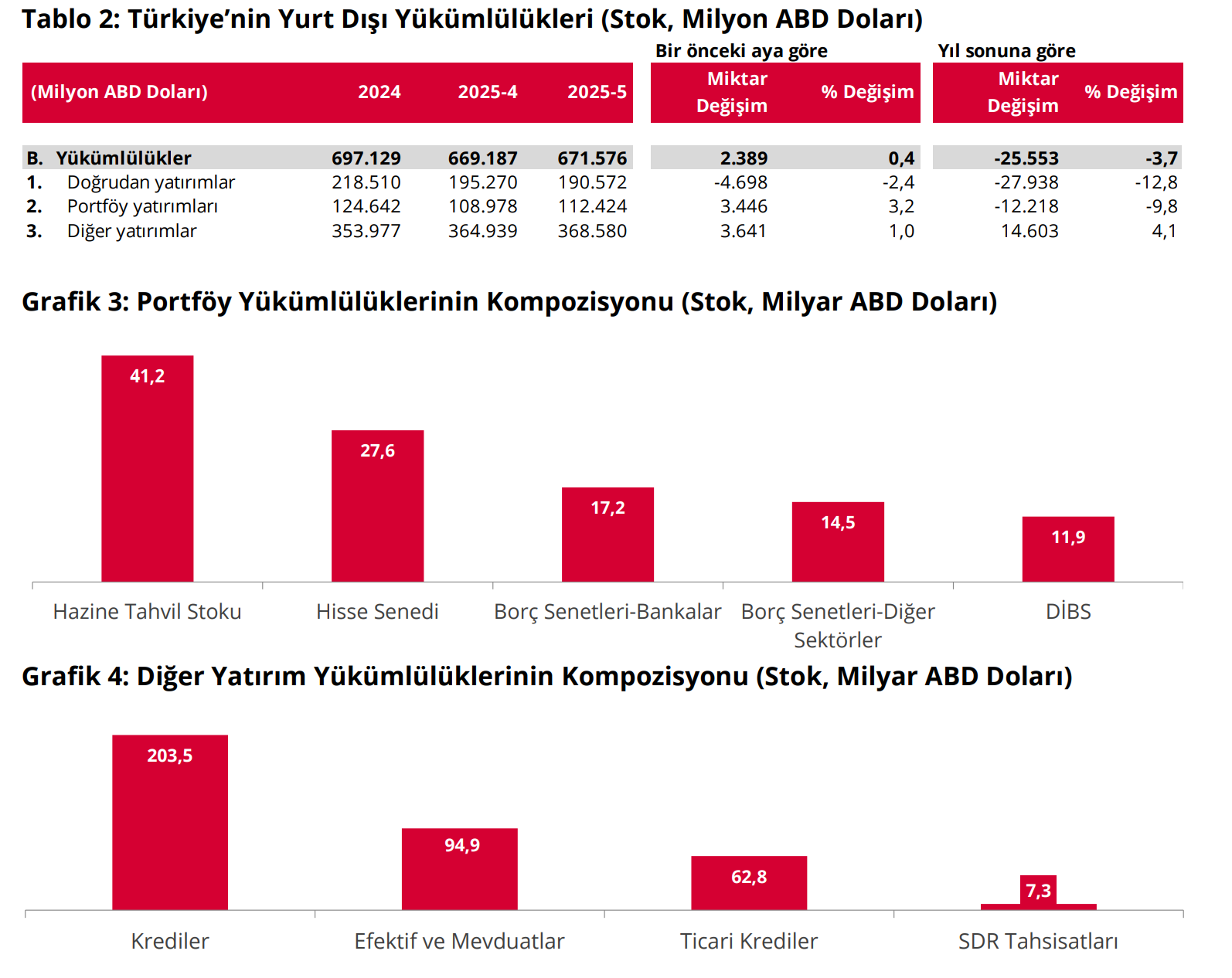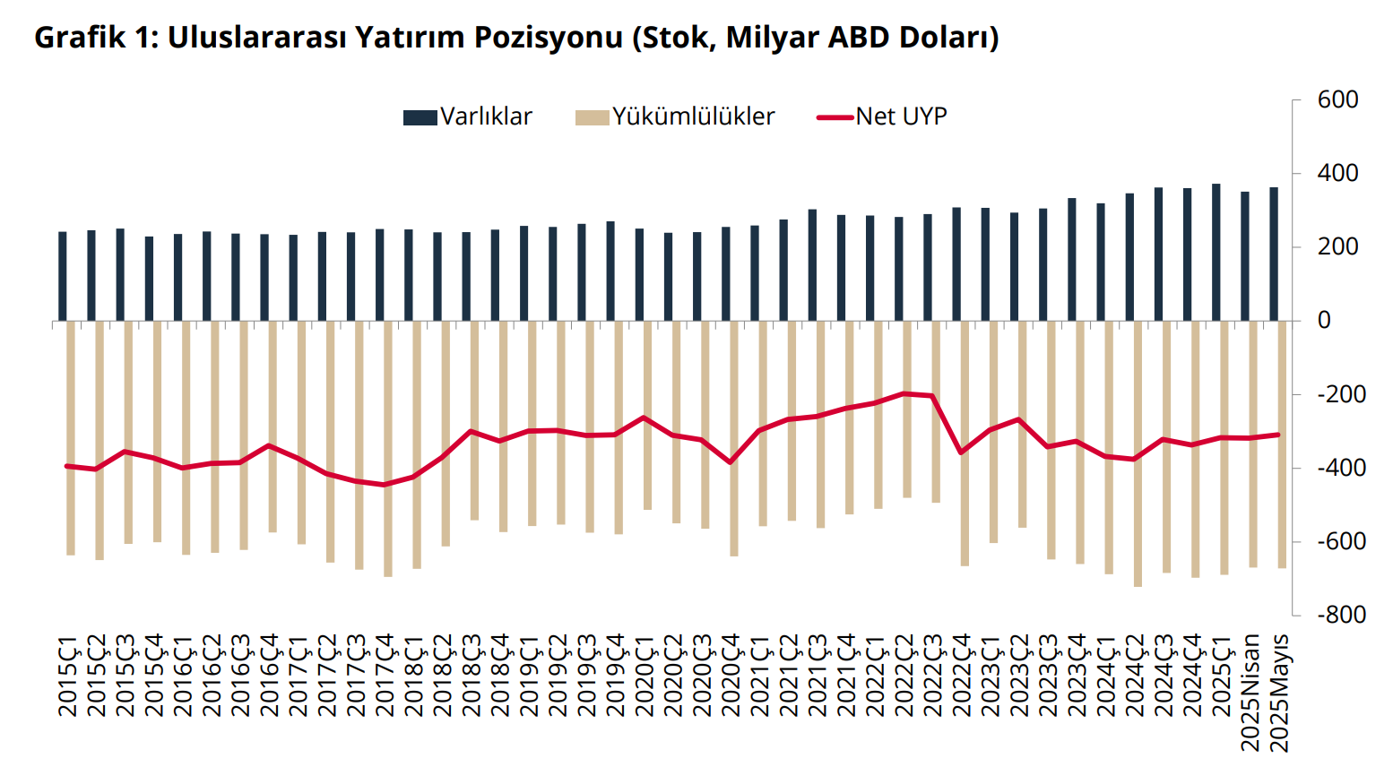 Türkiye'nin mayıs sonu itibarıyla yurt dışı varlıkları 362,5 milyar dolar, yurt dışı yükümlülükleri ise 671,6 milyar dolar olarak hesaplandı. Böylece uluslararası yatırım pozisyonu 309 milyar dolar açık verdi. Türkiye Cumhuriyet Merkez Bankası (TCMB), Mayıs 2025 dönemine ilişkin Uluslararası Yatırım Pozisyonu (UYP) verilerini açıkladı. Mayıs ayı itibarıyla Türkiye’nin yurt dışı varlıkları, bir önceki ay sonuna göre %3,3 oranında artışla 362,5 milyar dolar, yükümlülükleri ise %0,4 oranında artışla 671,6 milyar dolar olarak gerçekleşti. Böylelikle, aynı dönemde Türkiye’nin net Uluslararası Yatırım Pozisyonu yükümlülükleri 9,2 milyon dolar azalarak -309 milyar dolar oldu. Kaynak: TCMB Varlık kalemleri bir önceki ay sonuna göre incelendiğinde, doğrudan yatırımlar kalemi %1,0 oranında artarak 68,9 milyar dolar ve diğer yatırımlar kalemi ise %3,0 oranında azalarak 136,2 milyar dolar olarak gerçekleşti. Bankaların yabancı para efektif ve mevduat varlıkları %11,0 oranında azalarak 39,3 milyar dolar oldu. Yükümlülükler altındaki portföy yatırımları alt kalemlerinden Genel Hükümet’in DİBS yükümlülükleri %27,4 oranında artışla 11,9 milyar dolar oldu. Yükümlülükler alt kalemleri yıl sonuna göre incelendiğinde, doğrudan yatırımlar kalemi, BIST 100 endeksindeki azalış ile döviz kurlarındaki artışın etkisiyle, 2025 yılı Nisan ayına göre %2,4 oranında azalışla 190,6 milyar dolar seviyesinde gerçekleşti. Portföy yatırımları kalemi %3,2 oranında artarak 112,4 milyar dolar ve diğer yatırımlar kalemi %1,0 oranında artarak 368,6 milyar dolar seviyesinde gerçekleşti. Kaynak: TCMB