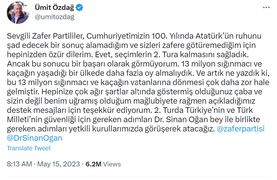 Zafer Partisi Genel Başkanı Ümit Özdağ, Gaziantep birinci sıradan milletvekili adayı olmasına karşı milletvekili seçilememesi sonrasında sosyal medya hesabı üzerinden konuyla ilgili, "Sizleri zafere götüremediğim için hepinizden özür dilerim" dedi. Gaziantep birinci sıradan milletvekili adayı olan Zafer Partisi Genel Başkanı Ümit Özdağ milletvekili seçilemedi. Özdağ, bunun üzerine Twitter üzerinden şöyle bir açıklama yaptı: “Sevgili Zafer Partililer, Cumhuriyetimizin 100. Yılında Atatürk’ün ruhunu şad edecek bir sonuç alamadığım ve sizleri zafere götüremediğim için hepinizden özür dilerim. Evet, seçimlerin 2. tura kalmasını sağladık. Ancak bu sonucu bir başarı olarak görmüyorum. 13 milyon sığınmacı ve kaçağın yaşadığı bir ülkede daha fazla oy almalıydık. Ve artık ne yazdık ki, bu 13 milyon sığınmacı ve kaçağın vatanlarına dönmesi çok daha zor hale gelmiştir. Hepinize çok ağır şartlar altında göstermiş olduğunuz çaba ve sizin değil benim uğramış olduğum mağlubiyete rağmen açıkladığımız destek mesajları için teşekkür ediyorum. İkinci turda Türkiye’nin ve Türk Milleti’nin güvenliği için gereken adımları Dr. Sinan Oğan Bey ile birlikte gereken adımları yetkili kurullarımızda görüşerek atacağız.” Kaynak: Ümit Özdağ - Twitter