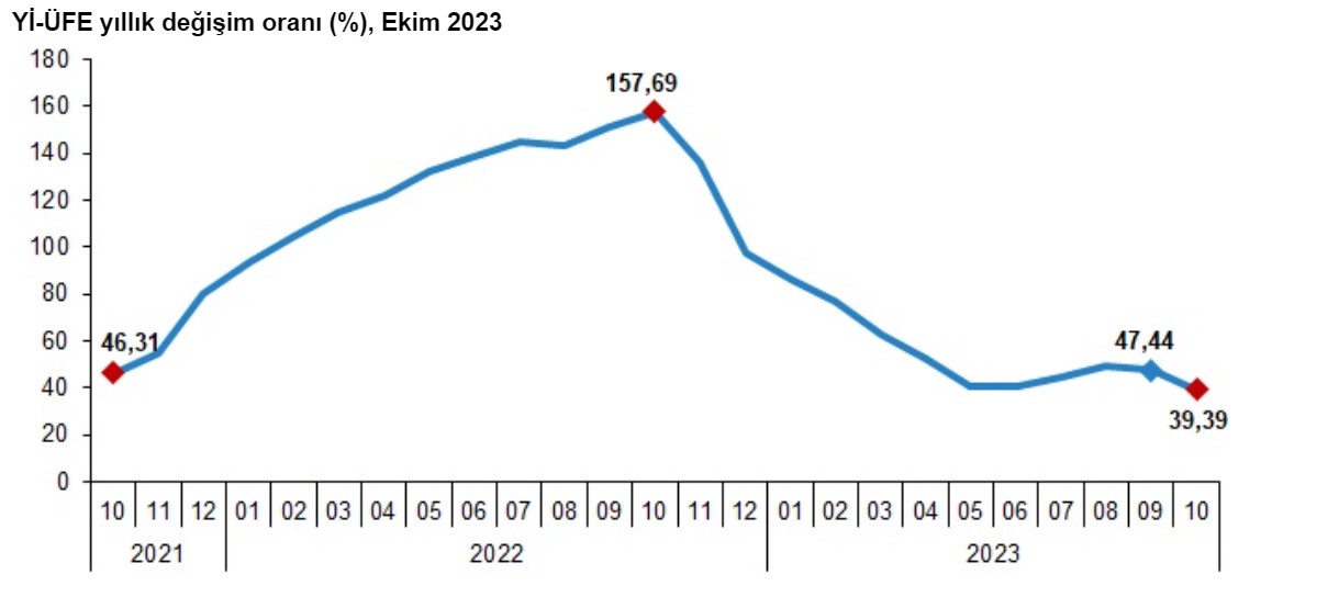 TÜİK verilerine göre Yurt İçi Üretici Fiyat Endeksi (Yİ-ÜFE) ekimde yıllık yüzde 39,39, aylık yüzde 1,94 arttı. Böylelikle veri, üretici enflasyonunun baz etkisiyle gerilediğini gösterdi. Türkiye İstatistik Kurumu (TÜİK) 2023 Ekim’e ilişkin Yurt İçi Üretici Fiyat Endeksini (Yİ-ÜFE) açıkladı. Buna göre, Yİ-ÜFE 2023 yılı Ekim ayında bir önceki aya göre yüzde 1,94, bir önceki yılın Aralık ayına göre yüzde 38,70, bir önceki yılın aynı ayına göre yüzde 39,39 ve on iki aylık ortalamalara göre yüzde 58,46 artış gösterdi. Kaynak: TÜİK En yüksek yıllık artış ve azalışlar Sanayinin dört sektörünün yıllık değişimleri; madencilik ve taş ocakçılığında yüzde 69,21 artış, imalatta yüzde 53,74 artış, elektrik, gaz üretimi ve dağıtımında yüzde 40,19 azalış, ve su temininde yüzde 72,72 artış olarak gerçekleşti. Ana sanayi gruplarının yıllık değişimleri; ara malında yüzde 45,58 artış, dayanıklı tüketim malında yüzde 61,37 artış, dayanıksız tüketim malında yüzde 67,47 artış, enerjide yüzde 12,91 azalış ve sermaye malında yüzde 65,19 artış olarak gerçekleşti. En yüksek aylık artış ve azalışlar Sanayinin dört sektörünün aylık değişimleri; madencilik ve taş ocakçılığında yüzde 3,36 artış, imalatta yüzde 2,32 artış, su temininde yüzde 5,46 artış ve elektrik, gaz üretimi ve dağıtımında yüzde 4,38 azalış olarak gerçekleşti. Ana sanayi gruplarının aylık değişimleri; ara malında yüzde 2,22 artış, dayanıklı tüketim malında yüzde 1,93 artış, dayanıksız tüketim malında yüzde 3,99 artış, sermaye malında yüzde 2,70 artış ve enerjide yüzde 2,86 azalış olarak gerçekleşti. Yıllık azalış gösteren alt sektör Yıllık azalış gösteren tek alt sektör yüzde 40,19 ile elektrik, gaz, buhar ve iklimlendirme oldu. Buna karşılık temel eczacılık ürünleri ve müstahzarları yüzde 94,85, diğer madencilik ve taş ocakçılığı ürünleri yüzde 92,48, içecekler yüzde 74,80 ile endekslerin en fazla arttığı alt sektörler oldu. Aylık en yüksek azalış; yüzde 14,10 ile tütün ürünleri, yüzde 4,38 ile elektrik, gaz, buhar ve iklimlendirme, yüzde 3,20 ile kok ve rafine petrol ürünleri alt sektörlerinde gerçekleşti. Buna karşılık ham petrol ve doğalgaz yüzde 6,48, basım ve kayıt hizmetleri yüzde 5,89, su ve suyun arıtılması ve dağıtılması yüzde 5,46 ile endekslerin en fazla arttığı alt sektörler oldu.