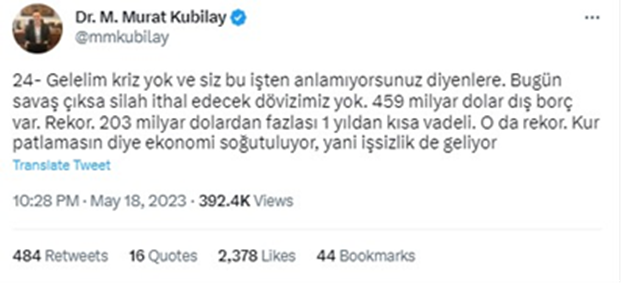 Ekonomist Murat Kubilay, Merkez Bankası açık pozisyonunun artmaya devam ettiğini belirterek, "Kur patlamasın diye ekonomi soğutuluyor, yani işsizlik geliyor" değerlendirmesinde bulundu. İktisatçı ve finans uzmanı Dr. Murat Kubilay, ekonomide yaşanan son gelişmeleri sosyal medya hesabı üzerinden 28 maddede özetledi. Dr. Kubilay'ın yaptığı paylaşımlar ise şu şekilde sıralandı: "1- Seçimlerde ilk tur geride kaldı. Rezervler tarihi dipte. Döviz alımında kısıtlamalar mevcut. Ancak Kapalıçarşı ve bankalararası piyasa arasındaki döviz kur farkı da azaldı. Dolar kuru resmi olarak sadece 19,80. Öyleyse neler oluyor? Herkesin anlayacağı şekilde açıklayalım. 2- Uzun hikayenin merkezinde yine rezervler ve örtülü döviz satışları var. Ancak bu sefer başrolde KKM var. KKM'ye hem dövizden hem de TL'den geçiş olabiliyor. Ancak son dönemdeki artış çok büyük ölçüde dövizden. Veriler açıklanmıyor ama döviz mevduat hacmindeki düşüş ima ediyor. 3- 6 Ocak 2023 kapanışı itibarıyla toplam KKM 73,2 milyar dolardı. 12 Mayıs kapanışı itibarıyla toplam hacim 119,9 milyar dolara ulaştı. Yani yaklaşık 4 ayda 46,7 milyar dolar yükseldi. KKM ile döviz bozanların dövizi swap ve zorunlu karşılıklarla TCMB'ye geçti. 4- Böylece TCMB elindeki yeni kurşunları da sonuna kadar kullandı. Başka kaynaklar da vardı, ancak uzun süredir başrol KKM'de ve bu eğilim ivmesini sürdürüyor. İhracatçıdan toplanan dövizler ise etkisiz. Hacmi fazla ama ithalat çıktısının çok gerisinde. 5- İhracattaki döviz geliri karşılığı sağlanan reeskont kredilerinin de önemi ihmal edilebilir düzeye düştü. İkinci ana faktörse Rusya. Yani Türkiye'deki seçimlere hala dolaylı müdahale söz konusu. Hatırlayalım, önce Akkuyu için önden para gelmiş ardından oligark paraları akmıştı. 6- Bu seferki ise BOTAŞ ile Gazprom arasındaki doğal gaz sözleşmesiyle ilintili. Resmi veri yok, çünkü Rusya bize kıyak geçmiş ve bunun karşılığında hangi ulusal çıkardan feragat ettiğimizi açıklamak istemiyorlar. İddia edilen miktar 24 milyar dolar. Bu kadar borcumuz ötelenmiş. 7- Geride kalan kış ılık geçti ancak yine doğal gaz yaktık ve alımlarda Rusya ana oyuncu oldu. Elektrik santralleri ve sanayi de doğal gaz yakıyor. Peki bu sürede BOTAŞ'a TCMB'den satılan döviz ne kadar? Tamı tamına 0. Hemen söyleyeyim, Kapalıçarşı BOTAŞ'ın dişinin kovuğuna yetmez. 8- Sırada rezervler var. Brüt altın ve döviz toplam rezerv 105,1 milyar dolar. Net rezervler sadece 2,3 milyar dolar. En son bu düzeye düştüğünde 21 yıl önce IMF anlaşması imzalamıştık. Şimdi farklı mı? Katar'dan 15, BAE'den 5, Çin'den 6 ve G. Kore'den 2 milyar dolar swap aldık. 9- Suudi Arabistan'dan 5, Azerbaycan'dan 2 ve Libya'dan 1 milyar dolarlık mevduatı da unutmayalım. Yaklaşık 36 milyar dolarlık swap ve mevduat anlaşması var. Bir de Rusya'dan 24 milyar dolarlık doğal gaz limiti. Hepsi büyük ölçüde kullanılmış. Yani ülke zaten IMF'lik halden beter. 10- Hadi bunları düşelim. Sizin ticari bankalarda durduğunu sandığınız döviz mevduat hesaplarının da bu bankalarca yine TCMB'ye swapla ödünç verildiğini hatırlatalım. Hazine'nin dış borç ve döviz ödemeler için ayırdığını düşelim. Kalan bakiye EKSİ 72 milyar dolar. 11- Şimdi tam da burada kendi kendime iktidar trollüğü veya muhalif kanat aşağılık kompleksi yapayım. "Abi, ülke battı diyorsunuz ama batmıyor, boş konuşuyorsunuz, bırakın bu CEHAPE ağızlarını, Reis bu işi biliyor, herkesin işi tıkırında, biraz objektif olun, sizden akıllılar!" 12- Bu üstteki ahmaklığa yazının sonunda döneceğim. Sıra altın rezervlerinde. Çünkü Kapalıçarşı ve bankalararası piyasadaki kur farkı bu nedenle kapandı. Olağan şartlar altında yurt içindeki altın satılamaz. Çünkü işlemi yapacak platformlar Londra, New York ve İsviçre'de. 13- 2022 sonu itibarıyla rezervlerin bir kısmı Londra'da İngiltere Merkez Bankası'nda. Hala orada mı, yoksa satıldı veya ipotek mi verildi bilmiyorum. Her şey olabilir, ancak spekülasyon yapmayalım. Sorunun cevabını Mart 2024'te veya iktidar değişirse ara denetimde alacağız. 14- Şubat sonunda mal mukabili altın ithalatına engelleme geldi. Dolar alamayan altın alıyor ve bu da rekor düzeyde altın ithalatına neden oluyordu. TCMB nasıl kamu bankalarıyla piyasaya döviz satıyorsa, bu sefer de Kapalıçarşı'ya doğrudan altın satmaya başladı. 15- Bu esnada altın fiyatları da yükselince bu çok fazla dikkat çekmedi. Zaten altınlar dolar karşılığı satılıyordu. Alınan altın bankalar üzerinden piyasaya veriliyordu. Fakat Ramazan Bayramı bitince TL karşılığı altın satılmaya başlandı. 16- Yani yeni bir müdahale yöntemi geliştirilmiş oldu. Tabii bunun neticesinde altın rezervleri hızla tükenmeye başladı. TCMB kasasındaki 844 ton altın 687 tona düştü. TCMB'nin bizzat kendine düşen altınlarda ise düşüş 558 tondan 414 tona geriledi. Bu veriler 12 Mayıs kapanışı. 17- TL karşılığı altın satılınca banka ile döviz büfeleri arasındaki kur farkı epey azaldı. Tabii başka önlemler de var. Misal döviz alımlarını sözlü yönlendirme ile engelleme. Nedense TCMB yöneticileri ıslak imza ile tebliğe cesaret edemiyor. Çünkü suç işliyorlar. 18- Sadece bu mu? Bir de TCMB, TL karşılığı vadeli döviz satıyor. Yılbaşında 700 milyon dolar olan açık pozisyon, şu anda 8 milyar dolar. Bu taahhüt KKM'ye benzer. Kur artarsa TCMB aradaki farkı aynen ödüyor. Fakat KKM'deki döviz olarak geri ödeme yok, TL cinsi veriliyor. 19- Elde bir silah daha var, kamu bankalarını açık pozisyona düşürmek. Pandeminin ilk aylarında kamu bankaları 12,2 milyar dolara kadar açığa düşürülmüştü. Hep bir ağızdan yapmayın, bankalardan kaçış başlar, aleni ihanet olur ded