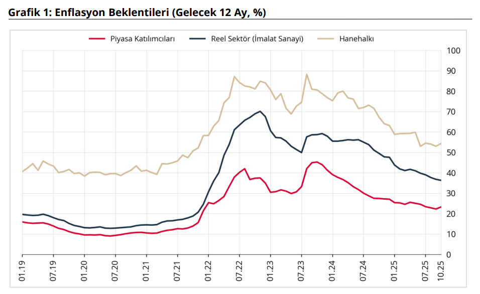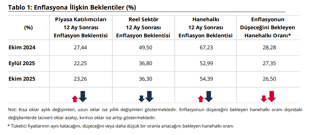 Türkiye Cumhuriyet Merkez Bankası (TCMB), ekim ayında piyasa katılımcıları, reel sektör ve hanehalkının 12 ay sonrasına ilişkin enflasyon beklentisini açıkladı. TCMB, Ekim 2025 dönemine ilişkin "Sektörel Enflasyon Beklentileri"ni yayımladı. Piyasa Katılımcıları Anketi, İktisadi Yönelim Anketi ve Türkiye İstatistik Kurumu (TÜİK) iş birliğiyle yürütülen Tüketici Eğilim Anketi ile finansal ve reel sektör uzmanlarının, imalat sanayi firmalarının ve hanehalkının 12 ay sonrası yıllık tüketici enflasyonu beklentileri derlenerek Sektörel Enflasyon Beklentileri elde edildi. 2025 yılı Ekim ayında 12 ay sonrası yıllık enflasyon beklentileri, piyasa katılımcıları için 1,01 puan artarak yüzde 23,26 seviyesine, hanehalkı için 1,40 puan artarak yüzde 54,39 seviyesine yükselirken, reel sektör için 0,50 puan azalarak yüzde 36,30 seviyesine gerilemiştir. Gelecek 12 aylık dönemde enflasyonun düşeceğini bekleyen hanehalkı oranı bir önceki aya göre 0,85 puan azalarak yüzde 26,50 seviyesinde gerçekleşmiştir.