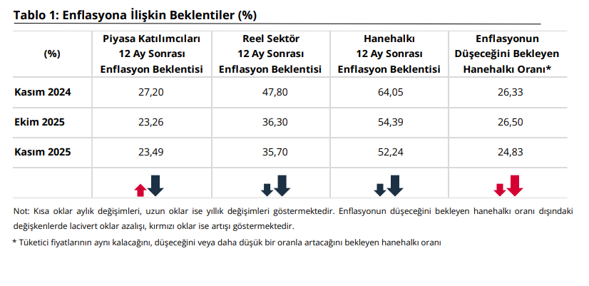 Türkiye Cumhuriyet Merkez Bankası (TCMB), kasım ayında piyasa katılımcıları, reel sektör ve hanehalkının 12 ay sonrasına ilişkin enflasyon beklentisini açıkladı. TCMB, Kasım 2025 dönemine ilişkin "Sektörel Enflasyon Beklentileri"ni yayımladı. Piyasa Katılımcıları Anketi, İktisadi Yönelim Anketi ve Türkiye İstatistik Kurumu (TÜİK) iş birliğiyle yürütülen Tüketici Eğilim Anketi ile finansal ve reel sektör uzmanlarının, imalat sanayi firmalarının ve hanehalkının 12 ay sonrası yıllık tüketici enflasyonu beklentileri derlenerek Sektörel Enflasyon Beklentileri elde edildi. 2025 yılı Kasım ayında 12 ay sonrası yıllık enflasyon beklentileri piyasa katılımcıları için 0,23 puan artarak yüzde 23,49 seviyesine yükselirken; reel sektör için 0,60 puan azalarak yüzde 35,70 seviyesine, hanehalkı için ise 2,15 puan azalarak yüzde 52,24 seviyesine geriledi. Gelecek 12 aylık dönemde enflasyonun düşeceğini bekleyen hanehalkı oranı bir önceki aya göre 1,67 puan azalarak yüzde 24,83 seviyesinde gerçekleşti. [news_id:792921]