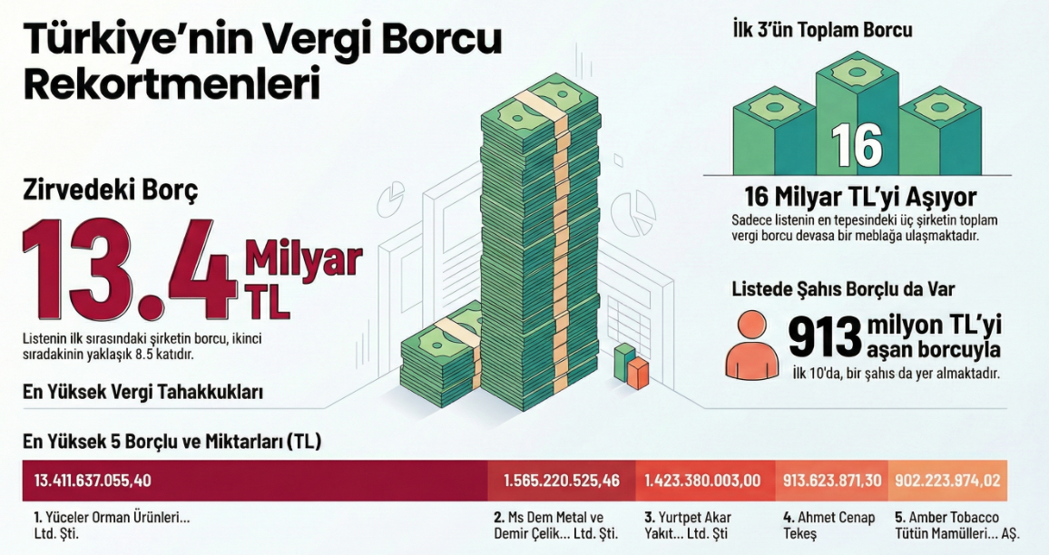 Gelir İdaresi Başkanlığı (GİB), devlete 5 milyon liranın üzerinde vergi borcu olan 56 bin 86 mükellefin 1 trilyon 507 milyar lira ödenmemiş vergi ve cezası bulunduğunu bildirdi. GİB, 5 milyon lirayı aşan vergi ve ceza borcu bulunan mükellefler ile 1 Haziran 2024-31 Mayıs 2025 tarihlerinde kesinleşen ve toplam tutarları 5 milyon lirayı aşan tarhiyatlara ilişkin listeleri açıkladı. Vergi Usul Kanunu kapsamında kesinleşen vergi ve cezalar ile vadesi geçtiği halde ödenmemiş vergi ve cezalar açıklanıyor. İkmalen, re'sen veya idarece yapılan tarhiyatlar nedeniyle kesinleşen ve toplam tutarı 5 milyon lira ve üzerinde olan vergi ve cezalar ile 31 Aralık 2024 tarihi itibarıyla vadesi geldiği halde 27 Kasım itibarıyla ödenmemiş ve tutarı 5 milyon lirayı aşan vergi ve cezalar iki ayrı listeyle duyuruldu. Borçlular listesine göre, devlete 5 milyon liranın üzerinde vergi borcu bulunan kişi ve kuruluş sayısı 56 bin 86'yı buldu. Bu mükelleflerin 12 bin 311'i gerçek, 43 bin 775'i ise tüzel kişi oldu. Mükelleflerin 10 bin 926'sı faal mükellef olurken, bunlar toplam mükellef sayısının yüzde 19,5'ini oluşturdu. Terk mükellef sayısı da 45 bin 160 olarak kayıtlara geçti. Vadesi geçtiği halde ödenmemiş vergi ve cezaların toplamı 1 trilyon 507 milyar lira olarak açıklandı. Faal mükelleflerin borç tutarı 263 milyar lira olurken, borç içindeki oranı yüzde 17,4 olarak belirlendi. Terk mükelleflerin borç tutarının da 1 trilyon 245 milyar lira olduğu tespit edildi. Borçlular listesinin ilk sırasında 7 milyar 737 milyon 922 bin lirayla Uray Vergi Dairesine kayıtlı Avrasya Sigara ve Tütüncülük Sanayi ve Ticaret AŞ yer aldı. Bu şirketi, 4 milyar 20 milyon 695 bin lirayla Turktab Tütün Mamülleri Pazarlama ve Dağıtım AŞ ve 3 milyar 191 milyon 253 bin lirayla Naksan Plastik ve Enerji Sanayi ve Ticaret AŞ takip etti. Kesinleşen tarhiyatlar listesi GİB sitesinde, kesinleşen tarhiyatlar listesi de açıklandı. Bu listede 3 bin 840 mükellef yer alırken, bunların 720'si gerçek, 3 bin 120'si tüzel kişi oldu. Bu mükelleflerin 575'i faal olurken, bunlar mükellef sayısının yüzde 15'ini oluşturdu. Terk mükellef sayısı da 3 bin 265 olarak kayıtlara geçti. Bu mükelleflerin kesinleşen vergi ve cezalarının toplamının 106,5 milyar lira olduğu tespit edildi. Bu tutarın 13,5 milyar lirasının faal mükelleflere, bakiye 93 milyar lirası ise terk mükelleflere ait olduğu kaydedildi. Listede, İlyasbey Vergi Dairesine kayıtlı Yüceler Orman Ürünleri Mobilya Yapı Malzemeleri Otomotiv Lojistik Ticaret Limited Şirketi 13 milyar 411 milyon 637 bin lirayla ilk sırada yer aldı. Bu şirketi 1 milyar 565 milyon 221 bin lirayla Ms Dem Metal ve Demir Çelik Ürünleri Taahhüt Pazarlama Sanayi ve Ticaret Limited Şirketi ve 1 milyar 423 milyon 380 bin lirayla Yurtpet Akar Yakıt LPG Dağıtım Paz. San. ve Tic. Ltd. Şti izledi. Vadesi geldiği halde ödenmemiş ve 5 milyon lirayı aşan borçlu mükellefler listesi şöyle: Kesinleşen ve miktarı 5 milyon lirayı aşan tarhiyatlara ilişkin liste ise şöyle: [news_id:795428]