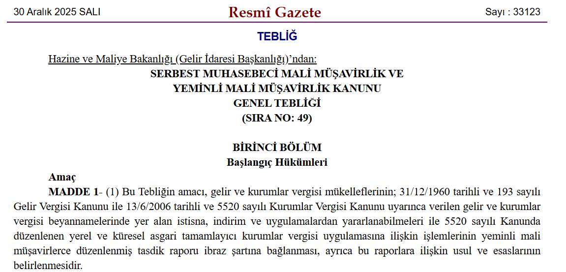 Gelir ve kurumlar vergisi mükelleflerinin istisna, indirim ve uygulamalardan yararlanabilmesi, yeminli mali müşavirlerce düzenlenmiş tasdik raporu ibrazı şartına bağlandı. Hazine ve Maliye Bakanlığı Gelir İdaresi Başkanlığının Serbest Muhasebeci Mali Müşavirlik ve Yeminli Mali Müşavirlik Kanunu Genel Tebliği, Resmi Gazete'de yayımlanarak yürürlüğe girdi. Buna göre, gelir ve kurumlar vergisi mükelleflerinin, ilgili kanunlar uyarınca verilen gelir ve kurumlar vergisi beyannamelerindeki istisna, indirim ve uygulamalardan yararlanabilmesi ile yerel ve küresel asgari tamamlayıcı kurumlar vergisi uygulamasına ilişkin işlemleri için yeminli mali müşavirlerce düzenlenmiş tasdik raporu ibraz etmesi gerekecek. Yeminli mali müşavirlerce yapılacak tasdik işlemiyle, mükelleflerin istisna, indirim ve uygulamalardan yararlanması için defter kayıtlarına dayanak teşkil eden belgelerinin, ilgili mevzuat hükümlerine uygun düzenlenip düzenlenmediğinin, gerçek durumu yansıtıp yansıtmadığının, hesaplamaların doğru beyan edilip edilmediğinin, istisna, indirim ve uygulamalara ilişkin belirtilen şartları sağlayıp sağlamadığının tespit edilmesi amaçlanıyor. Tasdik raporları, ilgili takvim yılı beyannamesi ile birlikte veya beyannamenin verilme süresinin bitimini takip eden 2 ay içerisinde dijital vergi dairesi üzerinden elektronik ortamda gönderilecek. Tasdik raporunun bu süre içerisinde de ibraz edilmemesi halinde, mükellef tasdike konu haktan yararlanamayacak. Gelir ve kurumlar vergisi istisna, indirim ve uygulama tasdik raporunun zamanında ibraz edilmemesi halinde ayrıca, özel usulsüzlük cezasına yönelik hüküm uygulanacak. Kaynak: Resmi Gazete