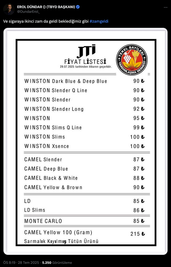 Sigara fiyatlarına yönelik zam furyası sürerken, 28 Temmuz 2025 tarihinde sigaralara ikinci kez zam uygulandığı bildirildi. Tekel Bayileri Yardımlaşma Derneği (TBYD) Başkanı Erol Dündar’ın sosyal medya üzerinden yaptığı açıklamayla kamuoyuna yansıyan yeni JTI grubu zam haberi, tütün tiryakilerini yine üzdü. "Ve Sigaraya İkinci Zam Da Geldi Beklediğimiz Gibi..." Erol Dündar’ın yaptığı paylaşımda, JTI grubuna ait sigaralarda 5 TL'lik yeni bir artışın yarından itibaren geçerli olacağı duyuruldu. Zam kararı sonrasında, JTI markalı en ucuz sigaranın fiyatı 85 TL'ye çıkarken, en pahalı sigaranın fiyatı ise 100 TL seviyesini gördü. Bu artışla birlikte ilk kez bir JTI grubu sigara fiyatı üç haneli rakama ulaşmış oldu. Özel tüketim vergisi sonrası ikinci zam dalgası TBYD Başkanı Erol Dündar, 17 Temmuz 2025 tarihinde yaptığı açıklamada, Temmuz ayında uygulanan Özel Tüketim Vergisi (ÖTV) artışının ardından sigara firmalarının henüz maliyetleri tam olarak fiyatlara yansıtmadığını ifade etmişti. Dündar, "ÖTV arttı ama firmalar bu miktarda zam yapmadı. Tek seferde 10 TL'lik zam yapmak yerine temmuz ayında 5 TL'lik zam yapıldı. Firmalar, zammı alıştıra alıştıra vermek istiyor. Bu yüzden önümüzdeki ay bir 5 TL'lik daha zam bekliyoruz" şeklinde konuşmuştu. JTI grubuna yapılan ikinci zamın, diğer sigara firmaları tarafından da benzer oranlarda fiyat ayarlamalarıyla takip edilmesi bekleniyor. Tütün ürünleri piyasasında fiyat artışlarının yalnızca JTI ile sınırlı kalmayacağı, sektör genelinde yeni zamların kapıda olduğu yorumlarına neden oldu.