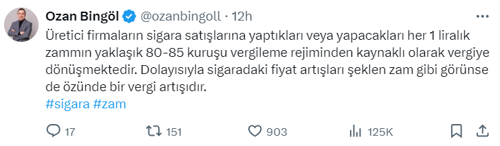Dün JTI grubuna ait sigaralara zam gelmesi üzerine Vergi Uzmanı Ozan Bingöl, sigaradaki fiyat artışının vergi hesabını yaptı. İşte detaylar.... Dün JTI grubuna gelen 8 TL’lik zam sonrasında grubun en pahalı sigarası 69 TL, en ucuzu ise 58 liraya yükseldi. [news_id:729365] Fiyat artışının ardından resmi X hesabı üzerinden gelen zammın ne kadarının vergi olduğuna dair hesap yapan Vergi Uzmanı Ozan Bingöl ise şu ifadeleri kullandı: "Üretici firmaların sigara satışlarına yaptıkları veya yapacakları her 1 liralık zammın yaklaşık 80-85 kuruşu vergileme rejiminden kaynaklı olarak vergiye dönüşmektedir. Dolayısıyla sigaradaki fiyat artışları şeklen zam gibi görünse de özünde bir vergi artışıdır." Kaynak: Ozan Bingöl - X