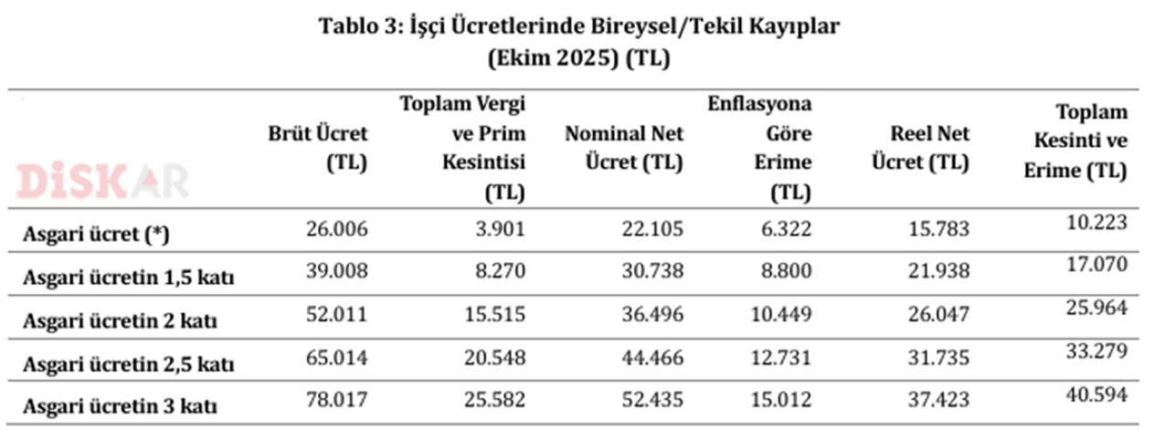 DİSK-AR’ın Ekim 2025 raporuna göre SGK kapsamındaki işçilerin 10 aylık kaybı toplam 1,8 trilyon TL’ye dayandı. Araştırmaya göre ortalama bir işçinin on aylık birikimli bireysel enflasyon, vergi ve kesinti kaybı ise 106 bin 524 TL oldu. Türkiye Devrimci İşçi Sendikaları Konfederasyonu Araştırma Merkezi (DİSK-AR) tarafından aylık olarak hazırlanan Ücret Kayıpları İzleme Raporu'nun Ekim 2025 verileri yayımlandı. Paylaşılan verilere göre, 2025’in onuncu ayında ortalama ücretin yarısı (yüzde 51,1’i) vergi, kesinti ve enflasyon nedeniyle eridi. Ortalama bir işçinin on aylık kaybı 106 bin lirayı aştı DİSK-AR verilerine göre ortalama işçi ücretinde Ocak 2025 tarihinde enflasyon nedeniyle yaşanan kayıp 1.910 TL iken Ekim 2025’te bu miktar 10 bin 873 TL’ye yükseldi. Gelir ile damga vergisi ve enflasyon nedeniyle ocak ayındaki erime 4 bin 910 TL iken bu miktar ekim ayında 18 bin 268 TL oldu. Araştırmaya göre ortalama bir işçinin on aylık birikimli bireysel enflasyon, vergi ve kesinti kaybı ise 106 bin 524 TL oldu. Toplam kayıpların çok daha büyük boyutlarda olduğu belirtilen raporda, sadece sigortalı işçilerin aylık enflasyon kaybının Ekim 2025’te toplam (tüm işçiler için) 184,6 milyar TL’ye ulaştığı enflasyon ve vergi kaynaklı toplam erimenin 310,1 milyar TL olduğu belirtildi. Birikimli erime 1,8 trilyon TL'ye dayandı Araştırmada on aylık birikimli erimenin (on ayın toplamı) ise 1,8 trilyon TL’ye yaklaştığı kaydedildi. Artan gelir vergisi yükü nedeniyle tüm işçiler için yaşanan on aylık birikimli toplam ücret erimesi (kesintiler hariç) 794,6 milyar TL olurken enflasyonun yarattığı kayıp 994,4 milyar TL’ye ulaştı. Böylece enflasyon ile vergilerin işçi ücretlerine on aylık toplam faturasının en az 1 trilyon 789 milyar TL olduğu belirtildi. Ücret gruplarına göre işçilerin yaşadığı kayıplar Araştırmada 5 işçi ücret grubu ele alınarak brüt ücretlerin gelir vergisi ve kesinti ile enflasyon karşısındaki tekil (bireysel) erimesi ortaya konuldu. Ücret gruplarına göre yaşanan kayıplar şöyle listelendi: Kaynak: DİSK-AR [news_id:790659]