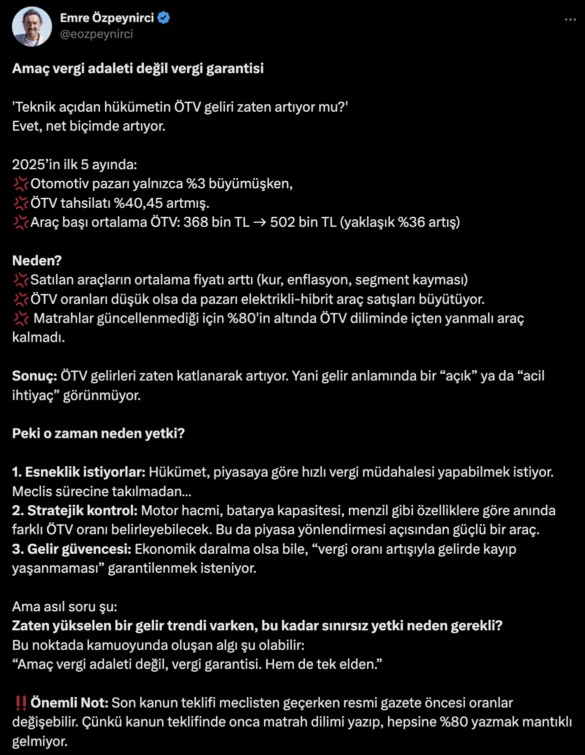 Ekonomi gazetecisi Emre Özpeynirci’nin değerlendirmesine göre, 2025 yılının ilk beş ayında otomotiv sektöründe sınırlı bir büyüme yaşanmasına rağmen ÖTV gelirlerinde dikkat çekici bir artış kaydedildi. Bu tabloya rağmen Meclis’e sunulan yeni ÖTV yetki talebi ise kamuoyunda tartışmalara yol açtı. Otomotiv Pazarı Sınırlı Büyürken ÖTV Tahsilatı Rekor Kırdı Emre Özpeynirci’nin verilerine göre, 2025 yılının Ocak-Mayıs döneminde otomotiv pazarı yalnızca yüzde 3 büyürken, aynı dönemde ÖTV tahsilatı yüzde 40,45 artarak 254 milyar TL seviyesini geçti. Araç başına ortalama ÖTV tutarı ise 368 bin TL’den 502 bin TL’ye yükseldi ve bu da yaklaşık yüzde 36,41’lik bir artış anlamına geldi. Mayıs ayında ise otomotiv pazarı yüzde 6,32 büyüyerek 111.600 adetlik satış hacmine ulaştı. Aynı ayda ÖTV geliri yüzde 20,87’lik bir artışla 54,2 milyar TL’ye çıktı. Yıl genelinde 2025 için belirlenen ÖTV tahsilat hedefi 818,8 milyar TL olarak açıklanmışken, yılın ilk beş ayında bu hedefin yüzde 32’si şimdiden gerçekleşti. Geçtiğimiz yılın aynı döneminde bu oran yüzde 36,42 olmuştu ve yıl sonunda hedefin aşıldığı görülmüştü. Vergi Artışının Temel Nedenleri: Fiyatlar, Matrahlar, Segment Kayması Bu vergi artışının nedenlerine de değinen Özpeynirci, satılan araçların ortalama fiyatlarının arttığını, döviz kuru ve enflasyon etkisiyle birlikte segment kaymasının yaşandığını ve en önemlisi matrah dilimlerinin güncellenmediğini vurguladı. Özellikle içten yanmalı araçların artık yüzde 80’in altındaki ÖTV dilimlerinde yer bulamaması, vergi yükünü doğrudan yukarı taşıdı. Elektrikli ve hibrit araçlar ÖTV avantajına sahip olsa da yüksek satış fiyatları nedeniyle toplam tahsilata ciddi katkı sundu. Bu Kadar Gelire Rağmen Yeni Vergi Yetkisi Neden Gündemde? Emre Özpeynirci'ye göre, hükümetin Meclis’e sunduğu yasa teklifiyle talep ettiği yetkinin üç temel gerekçesi bulunuyor: ''1. Esneklik istiyorlar: Hükümet, piyasaya göre hızlı vergi müdahalesi yapabilmek istiyor. Meclis sürecine takılmadan… 2. Stratejik kontrol: Motor hacmi, batarya kapasitesi, menzil gibi özelliklere göre anında farklı ÖTV oranı belirleyebilecek. Bu da piyasa yönlendirmesi açısından güçlü bir araç. 3. Gelir güvencesi: Ekonomik daralma olsa bile, “vergi oranı artışıyla gelirde kayıp yaşanmaması” garantilenmek isteniyor.'' Özpeynirci’nin aktardığı önemli bir diğer not ise teklifin Resmî Gazete’de yayımlanmadan önce değişebileceği yönünde. Çünkü “kanun teklifinde onca matrah dilimi yazıp, hepsine yüzde 80 yazmak mantıklı gelmiyor.” ifadeleriyle, vergi dilimlerinin tamamına aynı oranı uygulamanın teknik açıdan sorunlu bir düzenleme olabileceği belirtiliyor.
