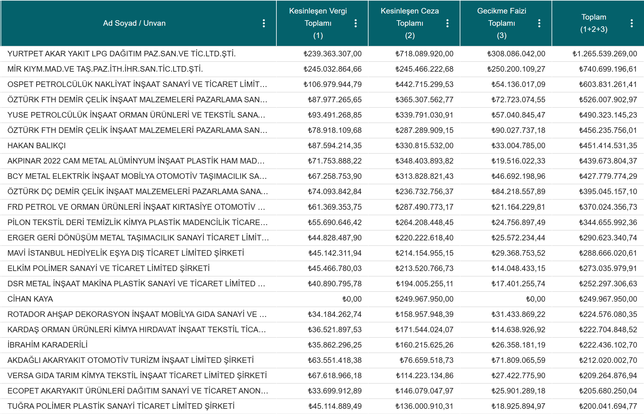 Devlete 5 milyon TL’nin üzerinde vergi borcu ve cezası bulunan 36 bin 806 mükellefin isimleri açıklandı. Hazine ve Maliye Bakanlığı Gelir İdaresi Başkanlığı, 5 milyon TL'yi aşan vergi ve ceza borcu bulunan mükelleflerin listesini yayımladı. Listede 36 bin 806 mükellefin ismi yer aldı. Hazine ve Maliye Bakanı Şimşek, 30 bin 696 ismin borcunun tahsil kabiliyeti olmadığını açıklamıştı. Ödenmemiş vergi ve cezaların toplamı 914,9 milyar lira olurken tahsil edilemiyecek alacak tutarı ise 812,8 milyar lira olarak belirlendi. "Listedeki herkes borçlu değil" Öte yandan Bakan Şimşek, listede vergi beyanlarında eksiklik bulunan veya hiç beyanname vermeyen ya da haksız yere vergi iadesi alan mükelleflerle ilgili yapılmış tarhiyatlardan kesinleşmiş olanların da bulunduğunu söylemişti. [news_id:751202] İki liste yayımlandı Borçlu mükellefler ise iki liste halinde açıklandı. İlk listede ikmalen, resen veya idarece yapılan tarhiyatlar nedeniyle kesinleşen vergi ve cezaları yer aldı. İkinci listede de vadesi geçtiği halde ödenmemiş vergi ve cezalar kamuoyuyla paylaşıldı. En çok vergi borcu olan mükellefler 1 Haziran 2023 ile 31 Mayıs 2024 tarihleri arasında kesinleşen ve toplam miktarı 5 milyon TL'yi aşan tarhiyatlar listesi (Mükellef/Vergi borcu): 1- Yurtpet Akaryakıt Ltd. Şti. - 1.265.539.269 TL 2- Mir Kıym. Mad. ve Tai. Ltd. Şti. - 740.699.196 TL 3- Ospet Petrolcülük - 603.831.261 TL Kaynak: GİB 31 Aralık 2023 tarihi itibarıyla vadesi geldiği halde 30 Eylül 2024 tarihi itibarıyla ödenmemiş bulunan ve 5 milyon TL'yi aşan borçlu mükellefler listesi: 1- Türktab Tütün Mamülleri A.Ş - 3.023.325.428 TL 2- Uluslarası Akaryakıt Dağıtım Ltd. Şti. - 2.449.525.198 TL 3- Enkad İnşaat Metal Ltd. Şti. - 2.255.026.863 TL Kaynak: GİB