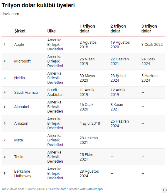 Warren Buffett'ın şirketi Berkshire Hathaway, dün kapanışta yüzde 0,8 yükselerek ilk kez 1 trilyon dolarlık piyasa değerini aştı. 2024 boyunca yüzde 30 artış kaydederek S&P 500'ün kazanımlarını geride bırakan şirket hisseleri Buffet'ın son on yıldaki en iyi başlangıçlarından birini gerçekleştirdiğini gösterdi. Öte yandan bu ay başında Berkshire Hathaway'in nakit stoku rekor seviye olan 276,9 milyar dolara yükselmişti. Ayrıca şirketin ikinci çeyrek faaliyet karı, geçen yılın aynı dönemindeki 10 milyar dolardan 11,6 milyar dolara yükselmişti. [news_id:742060] Böylelikle Warren Buffett'ın holdingi, teknoloji sektörünün dışında 1 trilyon dolar barajını aşan ilk ABD şirketi oldu. Berkshire Hathaway, 1 trilyon dolarlık değere ulaşmasıyla Nvidia, Microsoft, Apple, Amazon, Meta Platforms, Alphabet, Tesla ve Saudi Aramco gibi teknoloji ve enerji devlerinin bulunduğu 'trilyon dolarlık şirketler' listesine de girdi. Apple bu listeye 2 Ağustos 2018'de girmişti. Apple'ın 2 trilyon dolar değeri aşması ise bundan yaklaşık 1 yıl sonra oldu. Ocak 2022'de ise Apple 3 trilyon dolarlık piyasa değerini gördü. Microsoft ise Nisan 2019'da 1 trilyon dolarlık piyasa değerine ulaştıktan sonra Ağustos 2020'de 2 trilyon dolarlık piyasa değeri, Ocak 2024'te ise 3 trilyon dolarlık piyasa değerine ulaştı. Listenin üçüncü sırasındaki Nvidia ise Mayıs 2023'te 1 trilyon dolar değere, Şubat 2024'te 2 trilyon dolar değere ve Haziran 2024'te 3 trilyon dolar değere ulaştı. 1 trilyon dolar değere ulaşan şirketlerin listesi şöyle: Tesla, şu anda bu şirketler arasında 1 trilyon dolar sınırının altında kalan tek şirket ve piyasa değeri 657,29 milyar dolar seviyesinde. [news_id:743913]