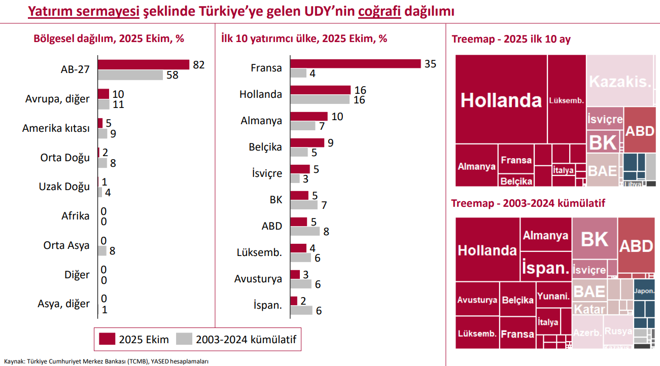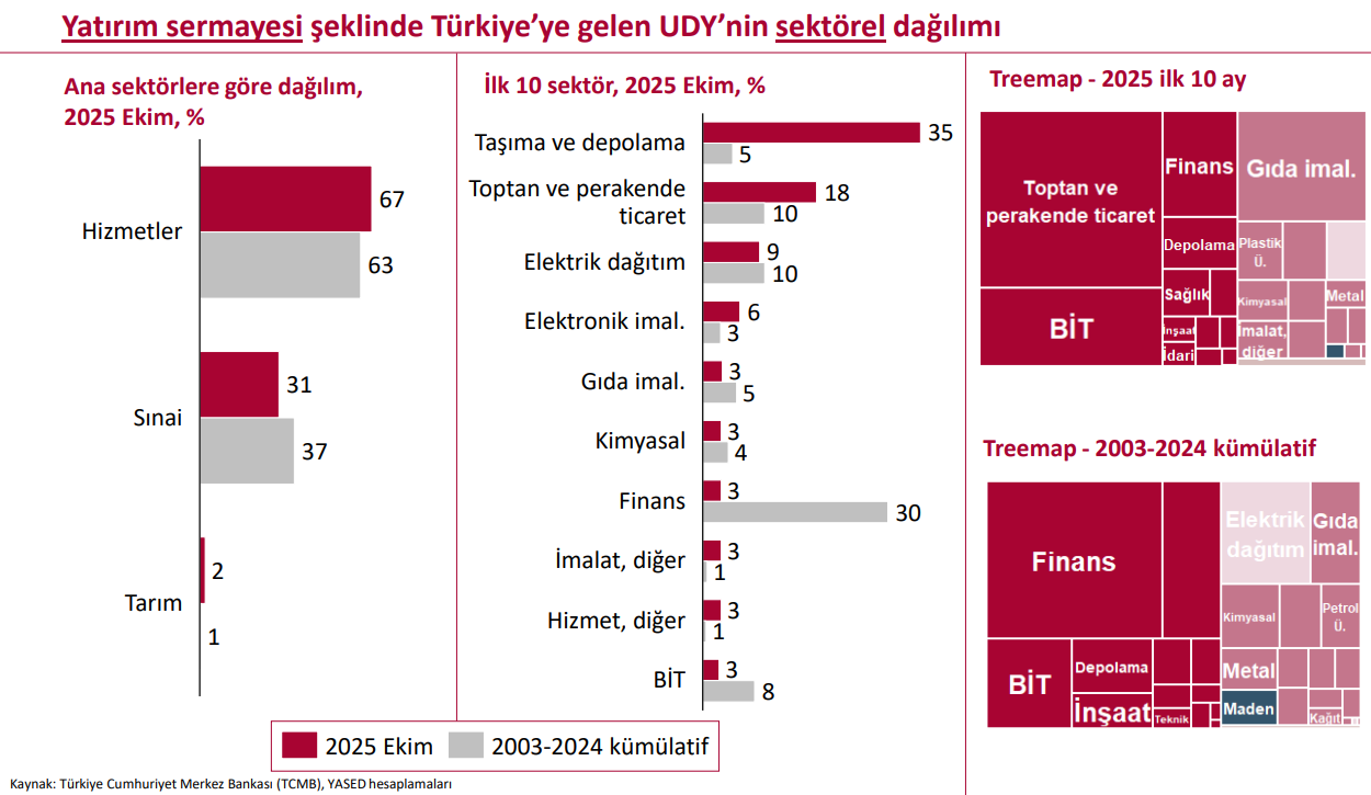 Türkiye'ye uluslararası doğrudan yatırım (UDY) girişi, yılın 10 ayında 11,6 milyar dolar olarak tespit edildi. Uluslararası Yatırımcılar Derneği (YASED), Rakamlarla Uluslararası Doğrudan Yatırımlar Bülteni'ni yayımladı. Buna göre ekimde 128 milyon dolar UDY girişi gerçekleşirken yılın 10 ayında Türkiye'ye gelen toplam UDY miktarı 11,6 milyar dolar olarak kaydedildi. Bu performans, 2024'ün aynı dönemine kıyasla yüzde 35'lik artışa işaret etti ve 2003'ten itibaren UDY girişlerinin toplam değeri 285 milyar doları aştı. Ekimde yatırım sermayesi girişleri 567 milyon dolar, yabancı uyruklulara gayrimenkul satışları 240 milyon dolar oldu. Borçlanma araçlarındaki 73 milyon dolarlık ve yatırım tasfiyelerindeki 606 milyon dolarlık aşağı yönlü etki sonucunda toplam UDY değeri 128 milyon dolar seviyesinde gerçekleşti. En fazla yatırım taşıma ve depolamada Ekimde gerçekleşen 567 milyon dolarlık yatırım sermayesi girişinin 199 milyon dolarını taşıma ve depolama sektöründe gerçekleşen yatırımlar oluşturdu. Taşıma ve depolamanın yüzde 35'lik payını takiben toptan ve perakende ticaret sektörü yüzde 18 payla, elektrik, gaz, buhar ve iklimlendirme üretimi ve dağıtımı sektörü de yüzde 9 payla öne çıktı. Yılın 10 ayı toplamı değerlendirildiğinde, 2,8 milyar dolarlık yatırımla toptan ve perakende ticaret, 1,2 milyar dolarlık yatırımla gıda imalatı ve 1,2 milyar dolarlık yatırımla Bilgi ve İletişim Teknolojileri (BİT) öne çıktı. En fazla uluslararası yatırım Fransa'dan Avrupa Birliği (AB-27) ülkeleri, 2003-2024 dönemi toplamında yatırımların tarihsel olarak yüzde 58’ini gerçekleştirirken, 2025'in 10. ayında yüzde 82'lik paya sahip oldu. Fransa, 198 milyon dolarlık yatırımı ve yüzde 35'lik payıyla bu değerdeki itici güç olurken ekimde bu ülkeyi yüzde 16 ile Hollanda, yüzde 10 ile Almanya, yüzde 9 ile Belçika ve yüzde 5 ile İsviçre takip etti. Yılın 10 ayında Türkiye'ye en fazla yatırımda bulunan üç ülke, 2,6 milyar dolarla Hollanda, 1,1 milyar dolarla Kazakistan ve 1,1 milyar dolarla Lüksemburg oldu.
