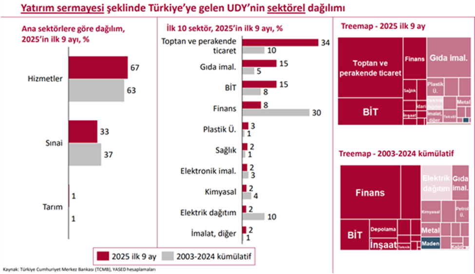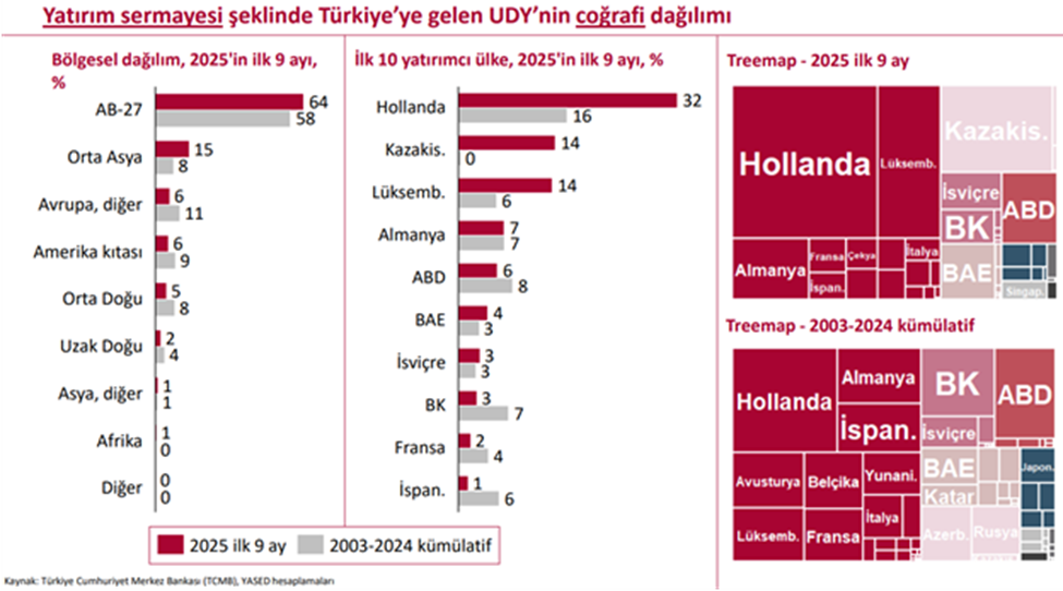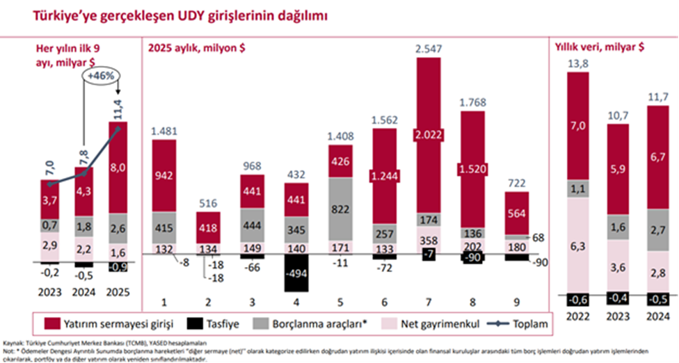 YASED, yılın ilk 9 ayında Türkiye’ye gelen toplam doğrudan yatırım miktarının geçen yılın aynı ayına göre yüzde 46 artışla 11,4 milyar dolara ulaştığını duyurdu. Uluslararası Yatırımcılar Derneği’nin (YASED) hazırladığı “Rakamlarla Uluslararası Doğrudan Yatırımlar Bültenine” göre, eylül ayında, Türkiye’ye 722 milyon dolarlık uluslararası doğrudan yatırım (UDY) girişi gerçekleşti. Böylece yılın ilk 9 ayında Türkiye’ye gelen toplam UDY miktarı, 11,4 milyar dolara ulaştı. Yılın ilk 9 ayında 2024’ün aynı dönemine kıyasla yüzde 46’lık bir artış kaydedilirken 2003 yılından itibaren Türkiye’ye gelen UDY girişlerinin toplam değeri ise 285 milyar doları aştı. Yılın ilk 9 ayında gerçekleşen 11,4 milyar dolarlık UDY girişinin 8 milyar doları yatırım sermayesi şeklinde oldu. Yabancı uyruklulara gayrimenkul satışı yoluyla 1,6 milyar dolar ve borçlanma araçları ile 2,6 milyar dolar değerinde UDY girişi kaydedildi. Yatırım tasfiyeleri ise 856 milyon dolar değerinde aşağı yönde etkiledi. En fazla yatırım toptan ve perakende ticarette 2025’in ilk 9 ayındaki 8 milyar dolarlık yatırım sermayesi girişinin 2,7 milyar dolarını toptan ve perakende ticaret sektöründe gerçekleşen yatırımlar oluşturdu. Toptan ve perakende ticaretin yüzde 34’lük payını takiben gıda ürünleri, içecek ve tütün imalatı sektörü yüzde 15 payla ikinci sırada yer alırken, bilgi ve iletişim hizmetleri sektörü de aynı oranda sermaye çekti. En çok yatırım Hollanda'dan 2003-2024 dönemi toplamında yatırımların tarihsel olarak yüzde 58’ini gerçekleştiren Avrupa Birliği (AB-27) ülkeleri, 2025’in ilk 9 ayında yüzde 64’lük bir paya sahip oldu. Yılın ilk 9 ayında ülkeler özelinde, Hollanda yüzde 32 ile en büyük paya sahip olurken, onu yüzde 14 ile Kazakistan, yüzde 14 ile Lüksemburg, yüzde 7 ile Almanya ve yüzde 6 ile ABD takip etti. [news_id:791535]