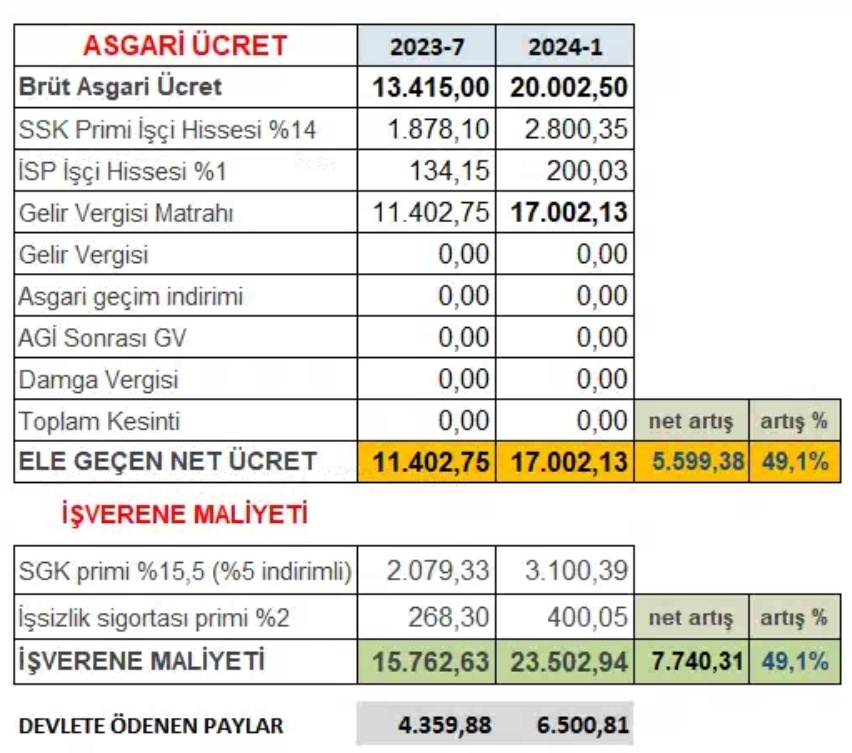 2024 yılında uygulanacak yeni asgari ücretin açıklanmasının ardından yeni asgari ücretin işverene maliyeti de belli oldu. Çalışma ve Sosyal Güvenlik Bakanı Vedat Işıkhan'ın kamuoyuyla paylaştığı yeni asgari ücretin detayları netleşti. Buna göre brüt 20 bin 2 lira 50 kuruş olan asgari ücretin, 17 bin 2 lira 13 kuruşunu net asgari ücret, 2 bin 800 lira 35 kuruşunu SGK primi ve 200 lira 3 kuruşunu işsizlik sigortası primi oluşturdu. Brüt 20 bin 2 lira 50 kuruş olan asgari ücrete, 3 bin 100 lira 39 kuruş SGK primi (işveren payı) ile 400 lira 5 kuruş işveren işsizlik sigorta primi kalemleri de eklenince yeni asgari ücretin bir işçi için işverene aylık maliyeti 23 bin 502 lira 94 kuruş oldu. (Asgari ücrete uygulanan vergi istisnaları korunursa & prim desteği öncesi) Kaynak: 507 - X [news_id:719451]