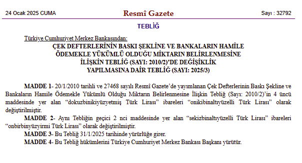 Türkiye Cumhuriyet Merkez Bankası (TCMB) tarafından hazırlanan ve Resmi Gazete’de yayımlanan yeni tebliğ ile çek defterlerinin baskı şekli ve bankaların hamile ödemekle yükümlü olduğu miktarlara ilişkin önemli değişiklikler yapıldı. Bu düzenleme kapsamında, özellikle karşılıksız çeklerde bankaların ödeme yükümlülüğü artırılarak işletmelerin ve bireylerin finansal güvenliği güçlendirilmeye çalışılmıştır. Yeni düzenlemeye göre, muhatap bankanın hamile ödemekle yükümlü olduğu miktar, her bir çek yaprağı için 9 bin 270 TL’den 12 bin 650 TL’ye yükseltildi. Bu artışın, özellikle karşılıksız çek sorunlarının azaltılması ve çek kullanan tarafların mağduriyet yaşamaması adına atılmış önemli bir adım olduğu, söz konusu değişiklikle birlikte, işletmelerin ve bireysel kullanıcıların güvenliğini artırmayı hedefleyen Merkez Bankası'nın çek ödeme sisteminde daha güçlü bir yapı oluşturmayı amaçladığı belirtildi. Önceki Tebliğlere Göre Bastırılan Çeklerde Yeni Ödeme Limiti Resmi Gazete’de yayımlanan tebliğ doğrultusunda, bu düzenlemenin yürürlüğe girmesinden önce bastırılmış olan çekler için de bankaların ödeme yükümlülükleri yeniden düzenlenmiştir. Buna göre, süresi içinde ibraz edilen ve karşılığı bulunmayan çekler için bankalar, her bir çek yaprağı başına 11 bin 120 TL’ye kadar ödeme yapmakla yükümlü olacak. Bu uygulama, önceki düzenlemelere tabi çekleri de kapsayarak mevcut çek sisteminde bütünlük sağlamayı amaçlamaktadır.