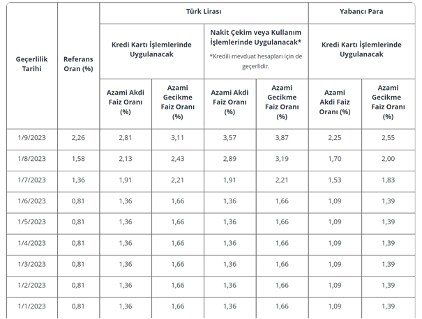 Merkez Bankası Para Politikası Kurulu’nun gösterge faizi 750 baz puanlık artışla yüzde 25’e yükseltmesinin ardından kredi kartları işlemlerinde uygulanan azami faiz oranları için baz alınan referans oran da yükseltildi. TCMB sitesinde yer alan bilgilere göre, 1 Eylül itibarıyla geçerli olmak üzere referans oran, yüzde 1,58’den yüzde 2,26’ya çıkarıldı. Kredi kartı azami akdi faiz oranı yüzde 2,13’ten yüzde 2,81’e yükseldi. Kredi kartı azami gecikme faiz oranı da yüzde 2,43’ten yüzde 3,11’e çıkartıldı. Ağustos ayında yüzde 2,89 olan nakit çekim veya kullanım işlemlerinde uygulanacak azami akdi faiz oranı ise yüzde 3,57’ye çekildi. İşte TCMB'nin yayımladığı tablo: Kaynak: TCMB Bankalar, TCMB’nin paylaştığı yeni oranları ise en erken 1 Eylül tarihinden itibaren uygulayabilecek. Öte yandan, "Tüketici sözleşmelerinde değişikliklerinin 1 ay erken bildirilmesi gereği" nedeniyle fiili uygulamanın eylül ayının son haftasına sarkabileceği bildiriliyor.