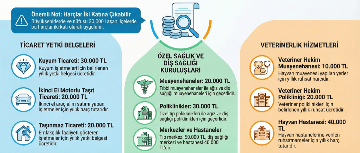 Vergi kanunlarına ilişkin torba yasa Resmi Gazete'de yayımlanarak yürürlüğe girdi. Yeni kararla birlikte sağlık kuruluşlarından kuyumculara, galericilerden veterinerlere kadar birçok kuruluşun ödeyeceği harçlar netlik kazandı. Bir süredir üzerinde çalışılan ve Meclis'ten geçerek kanunlaşan düzenlemeler Resmi Gazete'de yayımlanarak yürürlüğe girdi. Kanunla birlikte birçok sektörü ilgilendiren yıllık ruhsat ve yetki belgesi harçları belirlendi. Özel sağlık kuruluşları, ağız ve diş sağlığı merkezleri, veteriner klinikleri ve hayvan hastaneleri için uygulanacak yıllık ruhsat bedelleri de kanunda açık şekilde yer aldı. Ticaret yetki belgeleri kapsamında, kuyum ticareti ile iştigal edilebilmesi için şubeler dahil kuyum işletmeleri adına düzenlenen yetki belgelerinden (Her yıl için) 30 bin lira, ikinci el motorlu kara taşıtı ticaretiyle iştigal edilebilmesi için şubeler dahil işletme adına düzenlenen yetki belgelerinden (Her yıl için) 20 bin lira, taşınmaz ticaretiyle iştigal edilebilmesi için şubeler dahil işletme ve sözleşmeli işletmeler adına düzenlenen yetki belgelerinden (Her yıl için) 20 bin lira alınacak. Özel sağlık ve diş sağlığı kuruluşlarının ödeyeceği harçlar Ayakta teşhis ve tedavi yapılan özel sağlık kuruluşlarına ait ruhsatnameler için her yıl, muayenehane uygunluk belgesi 20 bin lira, özel poliklinik ruhsatnamesi 30 bin lira, özel tıp merkezi ruhsatnamesi 50 bin lira olarak uygulanacak. Ağız ve diş sağlığı hizmeti sunulan özel sağlık kuruluşlarına ait ruhsatnamelerde her yıl için, ağız ve diş sağlığı muayenehanelerinden 20 bin lira, Ağız ve diş sağlığı polikliniklerinden 30 bin lira, ağız ve diş sağlığı merkezlerinden 40 bin lira, Ağız ve diş sağlığı hastanelerinden 40 bin lira alınacak. Hayvanların muayene edildiği, hastalıklarının teşhis ve tedavilerinin yapıldığı muayenehane ve poliklinikler ile hastanelere verilen ruhsatnameler için her yıl Veteriner hekim muayenehane ruhsatı 10 bin lira, Veteriner hekim poliklinik ruhsatı 20 bin lira, Hayvan hastanesi ruhsatı 40 bin lira olacak. Resmi Gazete’de yayımlanan karara göre büyükşehir belediyesi olan illerde ve nüfusu 30 binin üzerindeki ilçelerde bu harçlar bir kat artırımlı uygulanacak. [news_id:795873]